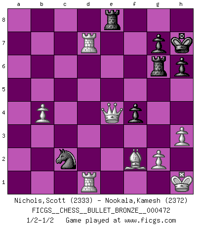 Last move : 1/2-1/2 2011 January 5 16:47:5 [Event "FICGS__CHESS__BULLET_BRONZE__000472"] [Site "FICGS"] [Date "2011.01.05"] [Round "1"] [White "Nichols,Scott"] [Black "Nookala,Kamesh"] [Result "1/2-1/2"] [WhiteElo "2333"] [BlackElo "2372"] 1.e4 c5 2.Nf3 d6 3.d4 cxd4 4.Nxd4 Nf6 5.Nc3 a6 6.Be2 e5 7.Nb3 Be7 8.O-O O-O 9.Kh1 Nc6 10.f4 b5 11.Bf3 Bb7 12.a4 b4 13.Nd5 Rc8 14.Nxe7+ Qxe7 15.f5 h6 16.Bd2 Rfe8 17.c3 Qd7 18.cxb4 Nd4 19.Nxd4 exd4 20.Be1 Bxe4 21.Bh4 Nd5 22.Qxd4 Qxf5 23.Bg3 Bxf3 24.Rxf3 Qe4 25.Qa7 f6 26.Qxa6 Nxb4 27.Qxd6 Nc2 28.Rc1 Qxa4 29.Qd5+ Kh8 30.Qd2 Qe4 31.Rd1 Qb7 32.Rd3 Kh7 33.Rd7 Qe4 34.Bf2 f5 35.h3 Rc6 36.Qd3 f4 37.b4 Rg6 38.Qxe4 1/2-1/2 Sicilian : Najdorf, Opovcensky variation Kingside Castling by player White (move 8) Kingside Castling by player Black (move 8) This chess game ended in a draw. Follow this game move after move (download)Chess is played with the mind and not with the hands ! (Renaud and Kahn) Das Blackmar-Diemer-Gambit verändert den ganzen Menschen! (Emil Joseph Diemer) Yo considero que Fischer es uno de los expertos mas grandes de aperturas de siempre. (Keith Hayward) Demandez au pauvre Cg1 ce qu'il en pense. Eduard Gufeld à propos de la variante Saemisch de l'Est-Indienne. Shallow men believe in luck. Strong men belive in cause and effect. (Ralph Waldo Emerson)