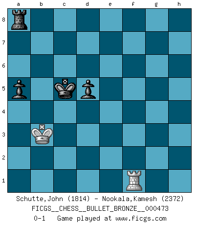 Last move : 0-1 2011 January 5 22:33:31 [Event "FICGS__CHESS__BULLET_BRONZE__000473"] [Site "FICGS"] [Date "2011.01.05"] [Round "1"] [White "Schutte,John"] [Black "Nookala,Kamesh"] [Result "0-1"] [WhiteElo "1814"] [BlackElo "2372"] 1.e4 c5 2.Nf3 d6 3.d4 cxd4 4.Nxd4 Nf6 5.Nc3 a6 6.h3 e5 7.Nde2 h5 8.Be3 Nbd7 9.Ng3 b5 10.Be2 g6 11.a4 b4 12.Nd5 Bb7 13.Bg5 Bxd5 14.exd5 Qa5 15.h4 Bg7 16.Bc4 e4 17.O-O O-O 18.Qd2 Rfe8 19.Rae1 Nc5 20.Qf4 Nh7 21.Nxe4 Nxe4 22.Rxe4 Rxe4 23.Qxe4 Nxg5 24.hxg5 Bxb2 25.Bb3 Bc3 26.f4 Qc5+ 27.Kh1 a5 28.Bc4 Kf8 29.Bb5 Ra7 30.f5 Re7 31.Qh4 gxf5 32.Bd3 Qe3 33.Bxf5 Qe2 34.Kg1 Bd2 35.Bd3 Qe3+ 36.Kh2 Qxg5 37.Qxg5 Bxg5 38.Rf5 f6 39.Kg3 Rc7 40.Kf2 Rc3 41.Rf3 Ra3 42.Rh3 h4 43.g3 hxg3+ 44.Kxg3 f5 45.Kf3 Kf7 46.Rh8 b3 47.cxb3 Rxb3 48.Ke2 f4 49.Rh5 f3+ 50.Kf2 Rxd3 51.Rxg5 Kf6 52.Rh5 Ra3 53.Kg3 Kg6 54.Rh8 Kf5 55.Re8 Rxa4 56.Kxf3 Rd4 57.Ke3 Rxd5 58.Ra8 Ke6 59.Ra7 Rb5 60.Kd4 Rc5 61.Ke4 Rc4+ 62.Kd3 Ra4 63.Kc2 Kd5 64.Kb3 Rb4+ 65.Kc3 Rb5 66.Ra8 Kc5 67.Rc8+ Kb6 68.Rb8+ Kc6 69.Rc8+ Kb7 70.Rd8 Rb6 71.Rd7+ Kc6 72.Ra7 Kb5 73.Rf7 Ra6 74.Rf5+ Kc6 75.Kb3 Ra8 76.Rf6 Kc5 77.Rf1 d5 0-1 This chess game has been lost on time (started : 2011.01.05 17:16:14) Sicilian : Najdorf, Adams attack Kingside Castling by player White (move 17) Kingside Castling by player Black (move 17) 10 pieces endgame at move 50 : White KRPP , Black KRBPPP WHITE : King + 1 Rook 2 Pawns BLACK : King + 1 Rook 1 Bishop 3 Pawns 9 pieces endgame at move 51 : White KRPP , Black KRPPP WHITE : King + 1 Rook 2 Pawns BLACK : King + 1 Rook 3 Pawns 8 pieces endgame at move 55 : White KRP , Black KRPPP WHITE : King + 1 Rook 1 Pawn BLACK : King + 1 Rook 3 Pawns 7 pieces endgame at move 56 : White KRP , Black KRPP WHITE : King + 1 Rook 1 Pawn BLACK : King + 1 Rook 2 Pawns 6 pieces endgame at move 57 : White KR , Black KRPP WHITE : King + 1 Rook BLACK : King + 1 Rook 2 Pawns Player Black won this chess game. Follow this game move after move (download)It is peculiar but a fact nevertheless, that gamblers in chess always have enthusiastic followers. (Botvinnik) Ich verstehe den Grund nicht, warum die Aufteilung in Frauen und Männer überhaupt im Schach besteht. (Judith Polgar) Los tropiezos estan todos ahí en el tablero, esperando que se cometan. (Savielly Tartakover) RxDa4 pat (...) He is a liar. I just don't know what the lie is yet. (Horatio Caine, C.S.I. Miami)
