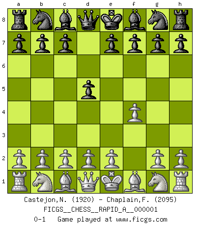 Last move : 0-1 2006 June 3 21:21:23 [Event "FICGS__CHESS__RAPID_A__000001"] [Site "FICGS"] [Date "2006.04.30"] [Round "1"] [White "Castejon,Nicolas"] [Black "Chaplain,Fabrice"] [Result "0-1"] [WhiteElo "1920"] [BlackElo "2095"] 1.f4 d5 0-1 This chess game has been lost on time (started : 2006.04.30 20:27:54) Bird's Opening Player Black won this chess game. Follow this game move after move (download)Even the laziest King flees wildly in the face of a double check ! (Aaron Nimzowitsch) Du musst nicht gut spielen, es reicht, wenn du besser spielst als dein Gegner. (Anonymous) Vive, pierde y aprende al observar a tu oponente como gana. (Amber Steenbock) Je ne suis pas le dernier à jouer lâchement des coups douteux pendant le zeïtnot de l'adversaire pour l'achever: en effet les coups qui font le plus peur sont ceux que l'on ne comprend pas. Je me fais souvent peur quand je joue. (Un professeur anonyme) I believe in luck. How else can you explain the success of those you dislike ? (Jean Cocteau)