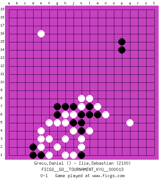 Last move : 0-1 2007 March 8 6:57:14 [Event "FICGS__GO__TOURNAMENT_KYU__000013"] [Site "FICGS"] [Date "2006.12.05"] [Round "1"] [Black "Grecu,Daniel"] [White "Ilie,Sebastian"] [Result "0-1"] [Rating 2 "2100"] 1.p15 q5 2.p14 e16 3.g7 e4 4.f4 f3 5.g3 f5 6.g4 e3 7.f2 e2 8.e1 g2 9.h2 f1 10.d2 g5 11.h4 h5 12.d1 j4 13.j3 k3 14.k4 h3 15.j2 k2 16.k1 l4 17.k5 h1 18.j5 j1 19.g6 j6 20.k6 k7 21.j7 h6 22.l7 k8 23.l6 l8 24.h7 m7 25.m6 n6 0-1 This go game has been lost on time (started : 2006.12.05 17:21:21) Here are the names of the openings (joseki) played in the four corners : Corner d4 : g7 e4 This joseki is unknown. A weak or weird move has probably been played in this corner. Player White won this Go (weiqi, baduk) game. Follow this game move after move (download)Very few good moves are played. (Pierre Audouard) Empty your mind, be formless, shapeless — like water. (Bruce Lee)