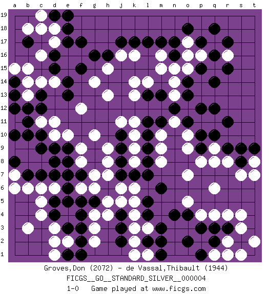 Last move : 1-0 2011 March 10 1:11:43 [Event "FICGS__GO__STANDARD_SILVER__000004"] [Site "FICGS"] [Date "2011.01.06"] [Round "2"] [Black "Groves,Don"] [White "de Vassal,Thibault"] [Result "1-0"] [Rating 1 "2072"] [Rating 2 "1944"] 1.q16 d17 2.q3 d3 3.q10 d10 4.k17 k4 5.q14 c6 6.f17 c14 7.m3 k6 8.m6 k8 9.j3 k3 10.f3 e2 11.j2 k2 12.l2 k1 13.f5 h5 14.f7 g10 15.d7 d6 16.e3 d2 17.j4 j5 18.e6 g4 19.c7 b6 20.d5 c5 21.d4 c4 22.f4 g6 23.g5 h4 24.h6 g7 25.g8 h7 26.j7 h8 27.g9 h9 28.e9 e10 29.d9 f6 30.e5 f8 31.e7 f9 32.e8 c8 33.c9 b8 34.b7 a7 35.c10 c11 36.b11 b9 37.c12 d11 38.b10 b13 39.b12 d14 40.a8 a9 41.a10 q8 42.c13 q6 43.r9 r8 44.o4 r4 45.r3 s4 46.f15 h13 47.e13 q17 48.r17 r16 49.p17 p16 50.q18 o15 51.p15 o16 52.o14 m15 53.m13 l14 54.l13 k14 55.h16 k13 56.e18 d18 57.d16 c16 58.d15 b15 59.d19 c19 60.e19 c18 61.l11 o10 62.p9 m10 63.l10 m9 64.l9 m8 65.l8 o7 66.l7 p11 67.q12 q11 68.r11 g3 69.n17 f12 70.f2 g2 71.d8 k11 72.s8 s7 73.s9 s3 74.s2 q9 75.p10 p8 76.o11 o9 77.p12 n11 78.n12 p4 79.p3 q4 80.e14 o5 81.n4 t2 82.k7 j6 83.j8 k9 84.j9 k10 85.j10 j11 86.e1 d1 87.f1 b3 88.a13 b14 89.n16 n15 90.e17 o17 91.o18 m16 92.m17 n13 93.m11 n14 94.b17 b18 95.o13 k16 96.l17 j16 97.j17 h15 98.g16 l1 99.m1 l3 100.m2 r2 101.q2 s1 102.l5 k5 103.l4 q1 104.p1 r1 105.o2 a6 106.a8 t8 107.t9 t7 108.r15 g14 109.a14 a15 110.a12 1-0 Here are the names of the openings (joseki) played in the four corners : Corner d16 : d17 f17 Komoku (Somok, Xiao~mu`) 3-4 Point. The komoku (3-4) point is the traditional corner enclosure move.. Player Black won this Go (weiqi, baduk) game. Follow this game move after move (download)Don't disturb symmetry. (Anonymous) However beautiful the strategy, you should occasionally look at the results. (Winston Churchill)