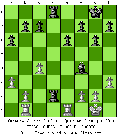 Last move : 0-1 2011 January 16 17:44:24 [Event "FICGS__CHESS__CLASS_F__000090"] [Site "FICGS"] [Date "2011.01.06"] [Round "1"] [White "Kehayov,Yulian"] [Black "Quanter,Kirsty"] [Result "0-1"] [WhiteElo "1071"] [BlackElo "1390"] 1.d4 d5 2.Nc3 Nf6 3.e3 Nc6 4.Nf3 g6 5.Bd3 Bg7 6.O-O O-O 7.e4 dxe4 8.Nxe4 Nxd4 9.Nxd4 Qxd4 10.Nxf6+ Qxf6 11.Qe2 Bf5 12.Qf3 Bxd3 13.Qxd3 Rfd8 14.Qe3 Rd5 15.c3 Qd6 16.h3 Be5 17.Qf3 Rd8 18.Be3 Qa6 19.a3 Qb5 20.Rab1 a6 21.Rfc1 Qa4 22.Bf4 Qxf4 23.Qxf4 Bxf4 24.Re1 e6 25.c4 Rd2 0-1 Queen's pawn : Chigorin variation Kingside Castling by player White (move 6) Kingside Castling by player Black (move 6) Player Black won this chess game. Follow this game move after move (download)It began to feel as though you were playing against Chess itself. - On playing against Robert Fischer. (Walter Shipman) Ein typischer, sehr verbreiteter Gedankenschädling ist der, daß der betreffende Amateur von der Annanhme ausgeht, daß jeder einzelne Zug etwas zu leisten habe. (Aaron Nimzowitsch) El ganador de una partida es aquel jugador que hace el penúltimo error. (Savielly Tartakover) Le système Elo représente seulement une moyenne. Il est simplement un indicateur de votre stabilité. (Anatoli Karpov) Strategy without tactics is the slowest route to victory. Tactics without strategy is the noise before defeat. (Sun Tzu)