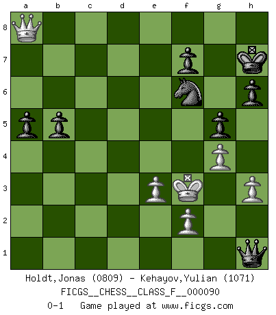 Last move : 0-1 2011 March 24 14:31:53 [Event "FICGS__CHESS__CLASS_F__000090"] [Site "FICGS"] [Date "2011.01.06"] [Round "1"] [White "Holdt,Jonas"] [Black "Kehayov,Yulian"] [Result "0-1"] [WhiteElo "0809"] [BlackElo "1071"] 1.b3 e5 2.Bb2 d6 3.e3 Nf6 4.Bc4 Be7 5.Ne2 O-O 6.O-O Bg4 7.h3 Bxe2 8.Bxe2 Nc6 9.Na3 d5 10.c4 dxc4 11.Nxc4 b5 12.Na3 a6 13.Bf3 e4 14.Bg4 Nxg4 15.Qxg4 Bf6 16.Bxf6 Qxf6 17.Qxe4 Rfe8 18.Qc2 Qd6 19.Rac1 Nb4 20.Qxc7 Qxd2 21.Rfd1 Qxa2 22.Nb1 Qxb3 23.Rd7 Nd5 24.Qb7 Nf6 25.Re7 a5 26.Nd2 Qb2 27.Rxe8+ Rxe8 28.Rd1 Qc2 29.Qf3 Rd8 30.g4 h6 31.Kg2 Rxd2 32.Rxd2 Qxd2 33.Qa8+ Kh7 34.Kf3 Qd1+ 35.Kf4 g5+ 36.Kg3 Qg1+ 37.Kf3 Qh1+ 0-1 Nimzovich-Larsen attack : Modern variation Kingside Castling by player Black (move 5) Kingside Castling by player White (move 6) Player Black won this chess game. Follow this game move after move (download)The most important feature of the Chess position is the activity of the pieces. This is absolutely fundamental in all phases of the game: Opening, Middlegame and especially Endgame. The primary constraint on a piece's activity is the Pawn structure. (Michael Stean) Wie kann ich Remis annehmen? Ich weiß ja gar nicht, wie ich stehe! (Fritz Sämisch) Sin errores no puede haber brillantez. (Emanuel Lasker) Le temps de noter son nom sur la feuille de partie, j'étais déjà en zeitnot ! D'un modeste amateur apparié lors de la première ronde d'un open contre le grand-maître Azmaïparashvili. Man is still the most extraordinary computer of all. (John F. Kennedy)
