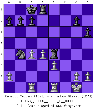Last move : 0-1 2011 January 21 9:8:8 [Event "FICGS__CHESS__CLASS_F__000090"] [Site "FICGS"] [Date "2011.01.06"] [Round "1"] [White "Kehayov,Yulian"] [Black "Khramkov,Alexey"] [Result "0-1"] [WhiteElo "1071"] [BlackElo "1279"] 1.e4 Nc6 2.d4 d5 3.e5 Bf5 4.Nf3 h6 5.Bd3 Bxd3 6.Qxd3 e6 7.O-O Qd7 8.c4 dxc4 9.Qxc4 O-O-O 10.Be3 f6 11.exf6 Nxf6 12.Qd3 e5 13.Rd1 e4 14.Qe2 exf3 15.Qxf3 Bb4 16.Nc3 Bxc3 17.bxc3 Qd5 18.Qxd5 Nxd5 19.c4 Nxe3 20.fxe3 Rhe8 21.Re1 Re4 22.Rac1 Nb4 0-1 KP : Nimzovich defense Kingside Castling by player White (move 7) Queenside Castling by player Black (move 9) Player Black won this chess game. Follow this game move after move (download)I believe that Chess possesses a magic that is also a help in advanced age. A rheumatic knee is forgotten during a game of Chess and other events can seem quite unimportant in comparison with a catastrophe on the chessboard. (Vlastimil Hort) Früher wurde jeder komplizierte Zug, jedes interessante Opfer mit großem Beifall und Enthusiasmus aufgenommen. Heute schaltet man einfach seinen Fritz an, und man kann sehen, was los ist, ob der Zug geht oder nicht. (Vladimir Kramnik) Jugadores de primera clase pierden en contra de jugadores de segunda clase porque los jugadores de segunda clase a veces juegan una partida de primer clase. (Siegbert Tarrasch) 'L'échange des dames est un coup dur pour les deux adversaires...' Un journaliste lors d'une partie du match Spassky-Fischer Coffee just isn't my cup of tea. (Unknown)