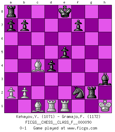 Last move : 0-1 2011 January 22 1:0:5 [Event "FICGS__CHESS__CLASS_F__000090"] [Site "FICGS"] [Date "2011.01.06"] [Round "1"] [White "Kehayov,Yulian"] [Black "Gramajo,Francisco"] [Result "0-1"] [WhiteElo "1071"] [BlackElo "1172"] 1.e4 c5 2.d4 Qa5+ 3.Qd2 Qxd2+ 4.Bxd2 cxd4 5.Nf3 Nc6 6.c3 dxc3 7.Nxc3 e6 8.Bc4 Nf6 9.O-O h6 10.h3 Bc5 11.Na4 d6 12.Nxc5 dxc5 13.Bc3 Nxe4 14.Bxg7 Rg8 15.Bxh6 Nd4 16.Nxd4 cxd4 17.Rad1 e5 18.Bc1 Bxh3 19.Rfe1 Rxg2+ 20.Kh1 Nxf2+ 0-1 Sicilian : Smith-Morra gambit Kingside Castling by player White (move 9) Player Black won this chess game. Follow this game move after move (download)The sign of a great Master is his ability to win a won game quickly and painlessly. (Irving Chernev) Kein Großmeister ist normal. Sie unterscheiden sich nur im Ausmaß Ihrer Verrücktheit. (Viktor Kortschnoi) En un gambito tu regalas un Peón por el bién de tomar un juego perdido. (Samuel Standige Boden) Toute estimation doit être constamment réévaluée. (Jacob Estrin) In theory there is no difference between theory and practice. In practice there is. (Yogi Berra)