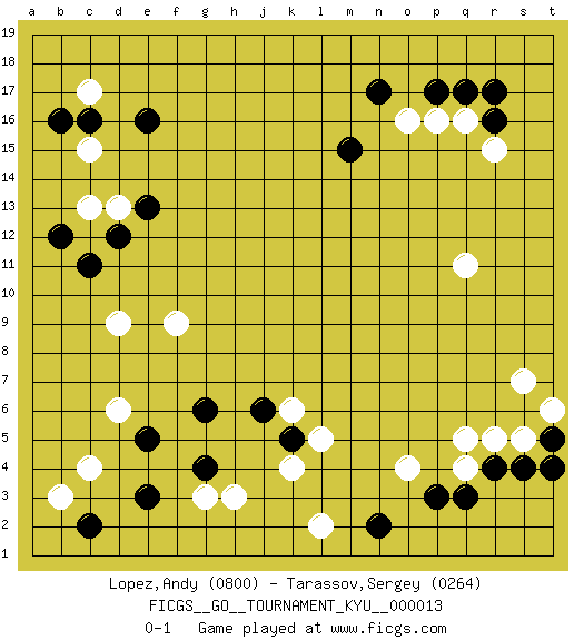 Last move : 0-1 2006 December 14 3:33:54 [Event "FICGS__GO__TOURNAMENT_KYU__000013 "] [Site "FICGS"] [Date "2006.12.05"] [Round "1"] [Black "Lopez,Andy "] [White "Tarassov,Sergey "] [Result "0-1"] [Rating 1 "0800"] [Rating 2 "0264"] 1.r16 c4 2.q3 o4 3.e3 g3 4.e5 d6 5.g4 h3 6.g6 d9 7.c16 p16 8.p17 q16 9.q17 r15 10.r17 o16 11.n17 q11 12.e16 q4 13.r4 r5 14.s4 s5 15.p3 q5 16.k5 k4 17.c11 c13 18.d12 d13 19.e13 c15 20.b12 c17 21.b16 l5 22.m15 f9 23.c2 b3 24.n2 l2 25.t5 t6 26.t4 s7 27.j6 k6 0-1 Here are the names of the openings (joseki) played in the four corners : Corner q4 : q3 o4Komoku (Somok, Xiao~mu`) 3-4 Point. The komoku (3-4) point is the traditional corner enclosure move.. Corner d4 : c4 e3Komoku (Somok, Xiao~mu`) 3-4 Point. The komoku (3-4) point is the traditional corner enclosure move..Ikken Kakari (Hankan Keolch'im, Yi Gua`jiao~, 1-Space Low Pincer). The small knight move is the basic approach move to the 3-4 point stone. It has been continually used for over four centuries. There are limitless variations, with new moves constantly being discovered. Black 2 opens the door to a treaure store of joseki. Corner q16 : r16 p16Komoku (Somok, Xiao~mu`) 3-4 Point. The komoku (3-4) point is the traditional corner enclosure move..Ikken Takagakari (Hankan Nop'dakeolch'im, Yi Gaogua`jiao~, 1-Space High Approach). The 5-4 approach move has become more popular in modern times, as modern Go emphasizes speed and influence. Player White won this Go (weiqi, baduk) game.Follow this game move after move (download ) Strange things happen at the one-two points. (Anonymous) Work expands to fill the time available. (C. Northcote Parkinson, in Parkinson's Laws)