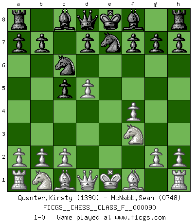 Last move : 1-0 2011 February 17 10:41:9 [Event "FICGS__CHESS__CLASS_F__000090"] [Site "FICGS"] [Date "2011.01.06"] [Round "1"] [White "Quanter,Kirsty"] [Black "McNabb,Sean"] [Result "1-0"] [WhiteElo "1390"] [BlackElo "0748"] 1.e4 c5 2.f4 e6 3.Nf3 Nc6 4.d4 Nge7 5.d5 exd5 6.exd5 1-0 This chess game has been lost on time (started : 2011.01.06 8:40:50) Sicilian : Grand Prix attack Player White won this chess game. Follow this game move after move (download)By playing at Chess then, we may learn: First: Foresight... Second: Circumspection... Third: Caution... And lastly, we learn by Chess the habit of not being discouraged by present bad appearances in the state of our affairs, the habit of hoping for a favorable chance, and that of persevering in the secrets of resources. (Benjamin Franklin) Ein Großmeister muß tausende Partien in seinem Kopf speichern, denn diese sind für Ihn, was die Worte der Muttersprache für gewöhnliche Leute sind, oder Noten für Musiker... (Garry Kasparov) El Ajedrez moderno está demasiado preocupado con cosas como la estructura de Peones. Olvidenlo, el Jaque Mate termina la partida. (Nigel Short) La victoire dans une partie d'Echecs appartient la plupart du temps à celui qui voit un peu plus loin que l'adversaire. (Lasker) Patience, use the Force, think ! (Obi-Wan Kenobi in Star Wars ep.2)