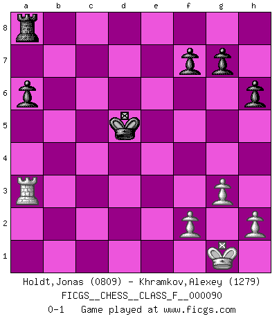Last move : 0-1 2011 June 24 20:3:57 [Event "FICGS__CHESS__CLASS_F__000090"] [Site "FICGS"] [Date "2011.01.06"] [Round "1"] [White "Holdt,Jonas"] [Black "Khramkov,Alexey"] [Result "0-1"] [WhiteElo "0809"] [BlackElo "1279"] 1.d4 d5 2.c4 dxc4 3.Nc3 e5 4.Nf3 exd4 5.Nxd4 c5 6.Nf3 Qxd1+ 7.Nxd1 Nc6 8.e4 Bd6 9.Bxc4 Nf6 10.O-O O-O 11.Nc3 Re8 12.Ng5 Ne5 13.Bb3 c4 14.Ba4 Bd7 15.Bxd7 Nexd7 16.Be3 h6 17.Nf3 Nxe4 18.Nxe4 Rxe4 19.Rad1 Re6 20.Rd4 Nb6 21.Rfd1 Bc7 22.g3 Rae8 23.Rg4 Re4 24.Rxe4 Rxe4 25.Nd4 Nd5 26.Bc1 Nf6 27.Nb5 Bb6 28.Nc3 Re7 29.Bf4 a6 30.a3 Rd7 31.Re1 Bc5 32.Ne4 Nxe4 33.Rxe4 b5 34.Re8+ Kh7 35.Ra8 Ra7 36.Rc8 Bd4 37.Rc6 Bxb2 38.a4 bxa4 39.Rxc4 a3 40.Ra4 Kg6 41.Be3 Ra8 42.Ra5 Kf6 43.Bc5 Ke6 44.Bxa3 Bxa3 45.Rxa3 Kd5 0-1 Queen's gambit accepted Kingside Castling by player White (move 10) Kingside Castling by player Black (move 10) Player Black won this chess game. Follow this game move after move (download)Live, lose, and learn, by observing your opponent how to win. (Amber Steenbock) Die meiste Zeit treffe ich auf Gegner, die meine Enkel sein könnten. Ich bin da, um ihnen zu zeigen, dass sie von mir noch einiges lernen können. (Viktor Kortschnoi) En posiciones complicadas, Bobby Fischer pocas veces tuvo que temer de cualquiera. (Paul Keres) Vous n'êtes pas toujours obligé de jouer le meilleur coup. Un coup doit être actif, entreprenant, correct et beau ! (David Bronstein) If you lose the game you should win the analysis! (Proverb)