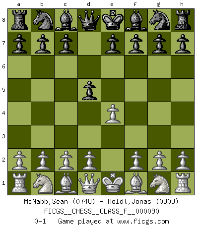 Last move : 0-1 2011 February 18 22:42:33 [Event "FICGS__CHESS__CLASS_F__000090"] [Site "FICGS"] [Date "2011.01.06"] [Round "1"] [White "McNabb,Sean"] [Black "Holdt,Jonas"] [Result "0-1"] [WhiteElo "0748"] [BlackElo "0809"] 1.e4 d5 0-1 This chess game has been lost on time (started : 2011.01.06 8:40:50) Scandinavian (centre counter) defense Player Black won this chess game. Follow this game move after move (download)All Chess players should have a hobby. (Savielly Tartakower) Schach ist wie eine schöne Frau, zu der wir ständig zurückkehren, gleichviel, wie oft sie uns zurückweist. (Anonymous) Aquel que teme a un Peón de Reina aislado, debería de retirarse del Ajedrez. (Siegbert Tarrasch) Les erreurs sont comme les malheurs, elles n'arrivent jamais seules. (Siegbert Tarrasch) But they are useless. They can only give you answers. (Pablo Picasso, about computers)