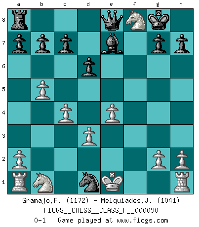 Last move : 0-1 2011 January 25 21:31:52 [Event "FICGS__CHESS__CLASS_F__000090"] [Site "FICGS"] [Date "2011.01.06"] [Round "1"] [White "Gramajo,Francisco"] [Black "Melquiades,Jay"] [Result "0-1"] [WhiteElo "1172"] [BlackElo "1041"] 1.e4 e5 2.Nf3 d6 3.Bc4 Be6 4.Bxe6 fxe6 5.c4 Nf6 6.d3 Nc6 7.Bg5 Be7 8.b4 Ng4 9.Be3 O-O 10.b5 Nd4 11.Bxd4 exd4 12.Nxd4 Nxf2 13.Nxe6 Qe8 14.Nxf8 Nxd1 0-1 Philidor's defense Kingside Castling by player Black (move 9) Player Black won this chess game. Follow this game move after move (download)The game of Chess is not merely an idle amusement; several very valuable qualities of the mind are to be acquired and strengthened by it, so as to become habits ready on all occasions; for life is a kind of Chess. (Benjamin Franklin) Kasparov ist eine Art Monster mit hundert Augen, denen auch nicht das Geringste entgeht. (Tony Miles) El poder defensivo de una pieza clavada, solamente es imaginario. (Aaron Nimzovich) L'ordinateur a tué l'originalité. Il n'y a plus guère d'aventures sur l'échiquier. (Jacob Murray) The good fighters of old first put themselves beyond the possibility of defeat, and then waited for an opportunity of defeating the enemy. (Sun Tzu)