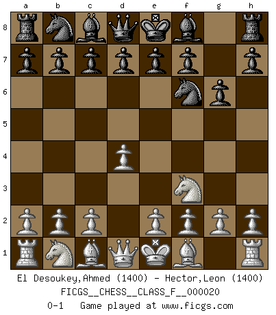 Last move : 0-1 2007 January 18 0:34:29 [Event "FICGS__CHESS__CLASS_F__000020"] [Site "FICGS"] [Date "2006.12.05"] [Round "1"] [White "El Desoukey,Ahmed"] [Black "Hector,Leon"] [Result "0-1"] [WhiteElo "1400"] [BlackElo "1400"] 1.d4 Nf6 2.Nf3 g6 0-1 This chess game has been lost on time (started : 2006.12.05 21:8:50) King's Indian : East Indian defense Player Black won this chess game. Follow this game move after move (download)Of Chess it has been said that life is not long enough for it, but that is the fault of life, not Chess. (William Ewart Napier) Ich verachte die Medien. (Robert James Fischer) Morphy probablemente fue el genio más grande de todos. (Bobby Fischer) Votre prénom est 'Tactique', votre deuxième prénom est 'Tactique' et votre nom est 'Tactique'. (Ken Smith) The message for business people contemplating their place in the cyberspace is simple and direct: get linked or get lost. (Vic Sussman and Kenan Pollack)
