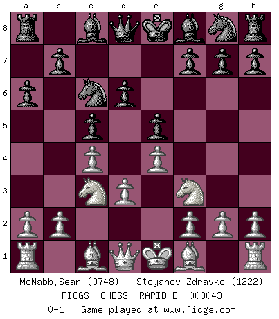 Last move : 0-1 2011 February 12 10:26:4 [Event "FICGS__CHESS__RAPID_E__000043"] [Site "FICGS"] [Date "2011.01.06"] [Round "1"] [White "McNabb,Sean"] [Black "Stoyanov,Zdravko"] [Result "0-1"] [WhiteElo "0748"] [BlackElo "1222"] 1.e4 c5 2.Nf3 a6 3.c4 Nc6 4.Nc3 e5 5.d3 d6 0-1 This chess game has been lost on time (started : 2011.01.06 19:50:42) Sicilian : O'Kelly variation Player Black won this chess game. Follow this game move after move (download)All I want to do, ever, is just play Chess. (Bobby Fischer) Je mehr ich von der FIDE weiss, um so weniger verstehe ich. (Alexander Kalifman) Alguna parte de un error es siempre correcto. (Savielly Tartakover) Je crois qu'il existe des manières très spécifiques de jouer efficacement contre une machine. Evidemment, nous n'avons aucune chance en technique pure, parce que l'ordinateur calcule de manière parfaite. Mais lorsque nous faisons appel à notre cerveau, en utilisant l'intuition et la compréhension, alors nous restons beaucoup plus forts. (Anatoli Karpov) Question: Is 'This statement is paradoxical' a paradoxical statement ? Or is it a meta-paradox ? (Normajean Yates)