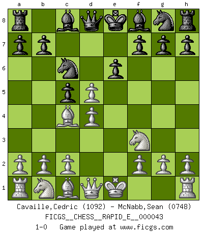 Last move : 1-0 2011 February 11 22:21:20 [Event "FICGS__CHESS__RAPID_E__000043"] [Site "FICGS"] [Date "2011.01.06"] [Round "1"] [White "Cavaille,Cedric"] [Black "McNabb,Sean"] [Result "1-0"] [WhiteElo "1092"] [BlackElo "0748"] 1.e4 c5 2.Nf3 Nc6 3.Bc4 e6 4.d4 d5 5.exd5 1-0 This chess game has been lost on time (started : 2011.01.06 19:50:42) Sicilian defense Player White won this chess game. Follow this game move after move (download)Daring ideas are like Chess men moved forward. They may be beaten, but they may start a winning game. (Johann Wolfgang von Goethe) Schach ist Krieg, im Schach geht es um testosterongesteuerte Urschreie. (Garry Kasparov) El Ajedrez es sobre todo, ¡una pelea!. (Emanuel Lasker) Soyez une menace à chaque fois que vous vous asseyez pour jouer. (Ken Smith) I couldn't make any sense out of what this particular thread is about. It sounds like R2 D2 computer speaking. A space fight ?!? Some 'command' problems in Moscow ? Some killers & narcotic addicts attacking some game & a god wannabe ?? (Dinesh De Silva, lost in a russian conflict in FICGS forum)