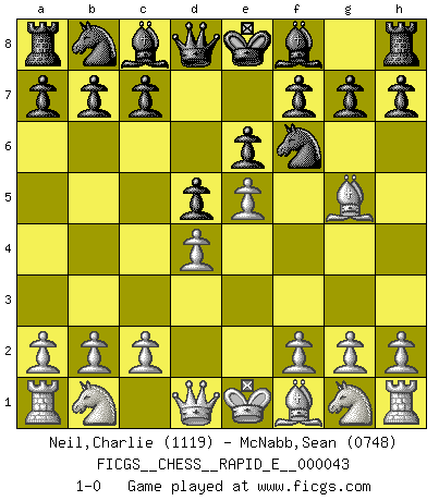 Last move : 1-0 2011 February 9 22:17:38 [Event "FICGS__CHESS__RAPID_E__000043"] [Site "FICGS"] [Date "2011.01.06"] [Round "1"] [White "Neil,Charlie"] [Black "McNabb,Sean"] [Result "1-0"] [WhiteElo "1119"] [BlackElo "0748"] 1.d4 Nf6 2.Bg5 e6 3.e4 d5 4.e5 1-0 This chess game has been lost on time (started : 2011.01.06 19:50:42) Trompowsky attack (Ruth, Opovcensky Opening) Player White won this chess game. Follow this game move after move (download)Chess opens and enriches your mind. (Saudin Robovic) Ich hatte Angst gegen einen russischen Großmeister zu verlieren, und er befürchtete gegen einen kleinen Jungen zu verlieren. (über ein Remis gegen Juri Awerbach). (Robert James Fischer) Puntos débiles o agujeros en la posición de tu oponente deben de ser ocupados por piezas, no Peones. (Siegbert Tarrasch) Horreur, mais aussi harmonie suprême : qu'y avait-il en effet au monde en dehors des échecs ? Le brouillard, l'inconnu, le non-être... (Vladimir Nabokov) There is no vagueness without wind. (Chinese proverb)