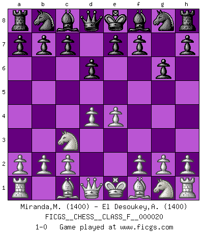Last move : 1-0 2007 January 17 6:31:41 [Event "FICGS__CHESS__CLASS_F__000020"] [Site "FICGS"] [Date "2006.12.05"] [Round "1"] [White "Miranda,Marcus"] [Black "El Desoukey,Ahmed"] [Result "1-0"] [WhiteElo "1400"] [BlackElo "1400"] 1.e4 d6 2.d4 g6 3.Nc3 1-0 This chess game has been lost on time (started : 2006.12.05 21:8:50) King's pawn Opening Player White won this chess game. Follow this game move after move (download)I had a toothache during the first game. In the second game I had a headache. In the third game it was an attack of rheumatism. In the fourth game, I wasn't feeling well. And in the fifth game? Well, must one have to win every game ? (Siegbert Tarrasch) Über Kasparov: Es ist offensichtlich, daß er in einem totalitären Staat aufwuchs und deshalb zu diktatorischen Zügen neigt. (Viktor Kortschnoi) Diferente gente reacciona diferentemente en aceptar la derrota. (Bobby Fischer) Si le désir cupide (et stupide) de gagner est une inépuisable source de souffrance, une combinaison brillante sur l'échiquier est une découverte : le coquelicot qui s'épanouit lorsque apparaît la Voie Lactée. (Arrabal) Nobody is always a winner, and anybody who says he is, is either a liar or doesn't play poker. (Amarillo Slim)