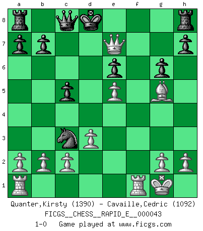 Last move : 1-0 2011 January 26 18:18:19 [Event "FICGS__CHESS__RAPID_E__000043"] [Site "FICGS"] [Date "2011.01.06"] [Round "1"] [White "Quanter,Kirsty"] [Black "Cavaille,Cedric"] [Result "1-0"] [WhiteElo "1390"] [BlackElo "1092"] 1.e4 c5 2.f4 d6 3.Nf3 Nf6 4.Bb5+ Bd7 5.Bxd7+ Qxd7 6.Nc3 d5 7.Ne5 Qc8 8.exd5 e6 9.dxe6 fxe6 10.d3 Nc6 11.O-O Nxe5 12.fxe5 Nd5 13.Qh5+ g6 14.Qf3 Nxc3 15.Qf7+ Kd8 16.Bg5+ Be7 17.Qxe7+ 1-0 Sicilian : Grand Prix attack Kingside Castling by player White (move 11) Player White won this chess game. Follow this game move after move (download)It is not a move, even the best move that you must seek, but a realizable plan. (Eugene Znosko-Borovsky) Ich bin stolz ein Bulgare zu sein. (Veselin Topalov) Uno no tiene que jugar muy bien, es suficiente jugar mejor que el oponente. (Siegbert Tarrasch) Aucun coup ne doit être joué sans but. (Pedro Damiano) However beautiful the strategy, you should occasionally look at the results. (Winston Churchill)