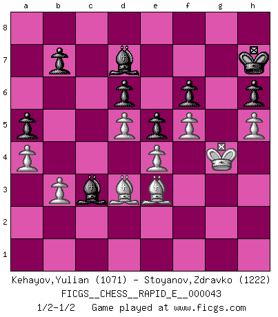 Last move : 1/2-1/2 2011 February 4 11:22:4 [Event "FICGS__CHESS__RAPID_E__000043"] [Site "FICGS"] [Date "2011.01.06"] [Round "1"] [White "Kehayov,Yulian"] [Black "Stoyanov,Zdravko"] [Result "1/2-1/2"] [WhiteElo "1071"] [BlackElo "1222"] 1.e4 c5 2.Nf3 a6 3.d4 cxd4 4.Nxd4 e6 5.Nf3 Nc6 6.Bd3 d6 7.O-O h6 8.c4 Qf6 9.Nc3 Nd4 10.Nxd4 Qxd4 11.Be3 Qe5 12.f4 Qf6 13.Qf3 Be7 14.Rac1 e5 15.f5 Bd7 16.b3 Bd8 17.Nd5 Qh4 18.Qf2 Qxf2+ 19.Rxf2 f6 20.Be2 Ne7 21.Rd1 Nxd5 22.cxd5 Bc7 23.Rf3 O-O 24.h3 Be8 25.Rc1 Ba5 26.a3 Bh5 27.g4 Be8 28.a4 Bd7 29.Rc2 Rfc8 30.Ra2 Rc3 31.Rb2 Bc7 32.Bd2 Bb6+ 33.Kg2 Rxf3 34.Kxf3 Rc8 35.Bd3 Bd4 36.Rc2 Bc5 37.Be3 a5 38.Rd2 Bb4 39.Rc2 Kh7 40.Rxc8 Bxc8 41.h4 g6 42.h5 gxf5 43.gxf5 Bd7 44.Kg4 Bc3 1/2-1/2 Sicilian : O'Kelly variation Kingside Castling by player White (move 7) Kingside Castling by player Black (move 23) This chess game ended in a draw. Follow this game move after move (download)You know, comrade Pachman, I don't enjoy being a Minister, I would rather play Chess like you. (Che Guevara) Warum muß ich gegen diesen IDIOTEN verlieren? (Aaron Nimzowitsch) Dejen al perfeccionista jugar por correo. (Yasser Seirawan) Il s'avisa de me proposer d'apprendre les échecs qu'il jouait un peu... me voilà forcené des échecs. J'achète un échiquier, je m'enferme dans ma chambre, j'y passe des jours et des nuits à vouloir apprendre par cur toutes les parties. (Jean-Jacques Rousseau, Confessions) If passion drives you, let reason holds the reins. (Benjamin Franklin)