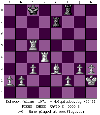 Last move : 1-0 2011 February 9 5:59:12 [Event "FICGS__CHESS__RAPID_E__000043"] [Site "FICGS"] [Date "2011.01.06"] [Round "1"] [White "Kehayov,Yulian"] [Black "Melquiades,Jay"] [Result "1-0"] [WhiteElo "1071"] [BlackElo "1041"] 1.e4 e5 2.Nf3 d6 3.Be2 a6 4.O-O Nc6 5.d4 Nf6 6.dxe5 dxe5 7.Qxd8+ Nxd8 8.Nxe5 Nxe4 9.Bd3 Nc5 10.Nc3 Be6 11.Nf3 h6 12.Ne4 Nc6 13.Nxc5 Bxc5 14.Re1 O-O-O 15.Ne5 Nd4 16.Be3 Nf5 17.Bxf5 Bxf5 18.Nxf7 Rhf8 19.Bxc5 Rxf7 20.c3 b6 21.Bd4 Be4 22.Rxe4 g5 23.Rae1 c5 24.Be3 g4 25.Rxg4 Re8 26.h3 h5 27.Rg6 Rd7 28.Rxb6 Kc7 29.Rxa6 Rd5 30.Re2 Rd1+ 31.Kh2 Kb7 32.Ra5 Rd7 33.Rxc5 Rg7 34.Rxh5 Reg8 35.g3 Rf8 36.Rd2 Re7 37.Rd4 Kc8 38.Rc5+ 1-0 Philidor's defense Kingside Castling by player White (move 4) Queenside Castling by player Black (move 14) Player White won this chess game. Follow this game move after move (download)Blessed be the memory of him who gave the world this immortal game. (A. G. Gardiner) Ich bin Weltmeister und muß mit niemandem irgend etwas diskutieren. (Viswanathan Anand) El Ajedrez es un terrible juego. Si no controlas el centro, tu oponente tiene una posición mas holgada. Si tienes control del centro, ¡entonces realmente tu tienes algo de que preocuparte!. (Siegbert Tarrasch) RxDa4 pat (...) There is far too much law for those who can afford it and far too little for those who cannot. (Derek Bok)