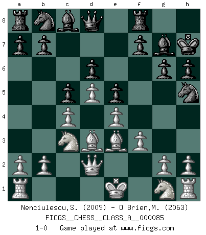 Last move : 1-0 2011 May 21 18:30:28 [Event "FICGS__CHESS__CLASS_A__000085"] [Site "FICGS"] [Date "2011.01.07"] [Round "1"] [White "Nenciulescu,Silviu"] [Black "O Brien,Matthew"] [Result "1-0"] [WhiteElo "2009"] [BlackElo "2063"] 1.d4 Nf6 2.c4 g6 3.Nc3 Bg7 4.e4 d6 5.f3 O-O 6.Bg5 c5 7.d5 h6 8.Bf4 Nh5 9.Be3 e5 10.Qd2 Kh7 11.Bd3 1-0 This chess game has been lost on time (started : 2011.01.07 7:46:30) King's Indian : Saemisch, 5...O-O Kingside Castling by player Black (move 5) Player White won this chess game. Follow this game move after move (download)Chess is as much a mystery as women. (Purdy) Ein guter Spieler hat immer Glück. (José Raúl Capablanca) El juego de Damas es para vagabundos. (Paul Morphy) En blitz, le Cavalier l'emporte sur le Fou. (Vlastimil Hort) Pushing plastic is for the many, pushing virtual pieces is for the fewer, pushing wood is for the very few. (Normajean Yates)