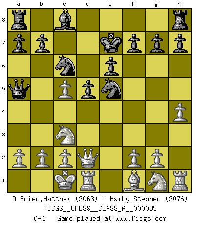 Last move : 0-1 2011 May 17 18:12:57 [Event "FICGS__CHESS__CLASS_A__000085"] [Site "FICGS"] [Date "2011.01.07"] [Round "1"] [White "O Brien,Matthew"] [Black "Hamby,Stephen"] [Result "0-1"] [WhiteElo "2063"] [BlackElo "2076"] 1.e4 e6 2.d4 d5 3.Nc3 Nf6 4.Bg5 Be7 5.e5 Nfd7 6.h4 c5 7.Bxe7 Kxe7 8.Qd2 Nc6 9.dxc5 Ndxe5 10.O-O-O Qa5 0-1 French : Albin-Alekhine-Chatard attack, Breyer variation Queenside Castling by player White (move 10) Player Black won this chess game. Follow this game move after move (download)To avoid losing a piece, many a person has lost the game. (Savielly Tartakover) Auf Remis zu spielen ist gewissermaßen ein Verbrechen gegen das Schachspiel. (Mikhail Nekhemyevich Tal) Un jugador que trata de regresar una movida en el Ajedrez es un futuro carterista. (Richard Fenton) C'est une question de caractère, Beaucoup de gens perdent leur motivation très vite. D'autres, ils sont rares, peuvent la conserver très longtemps. J'aime les échecs, encore aujourd'hui je suis heureux d'analyser des parties. J'aime toujours gagner, je déteste encore perdre. Bien jouer est important pour mon intégrité intellectuelle et morale. Et puis les échecs vivent en ce moment une période historique grâce à Internet. Ils se développent dans les systèmes éducatifs à travers le monde. Ils sortent de leur ghetto, et c'est mon rôle de mener à bien cette révolution. (Gary Kasparov) Once you start thinking you have nothing left to learn, you have everything to learn. (Steve Badget)