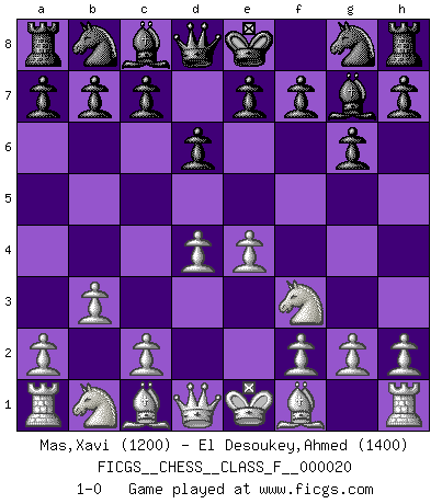 Last move : 1-0 2007 January 16 12:27:52 [Event "FICGS__CHESS__CLASS_F__000020"] [Site "FICGS"] [Date "2006.12.05"] [Round "1"] [White "Mas,Xavi"] [Black "El Desoukey,Ahmed"] [Result "1-0"] [WhiteElo "1200"] [BlackElo "1400"] 1.e4 d6 2.d4 g6 3.Nf3 Bg7 4.b3 1-0 This chess game has been lost on time (started : 2006.12.05 21:8:50) King's pawn Opening Player White won this chess game. Follow this game move after move (download)Chess is a part of culture and if a culture is declining then Chess too will decline. (Mikhail Botvinnik) Im Internet Chess Club betrug mein Rating vorübergehend 3350 ELO-Punkte. (Sergej Karjakin) El Ajedrez expande y enriquece tu mente. (Saudin Robovic) Le jeu d'échecs fait naître et fortifie en nous plusieurs qualités précieuses dans le cours de l'existence, telles que la prévoyance, la circonspection, la prudence, et la persévérance. (Benjamin Franklin - 1783, la morale des échecs) What doesn't kill us makes us stronger. (Friedrich Nietzsche)
