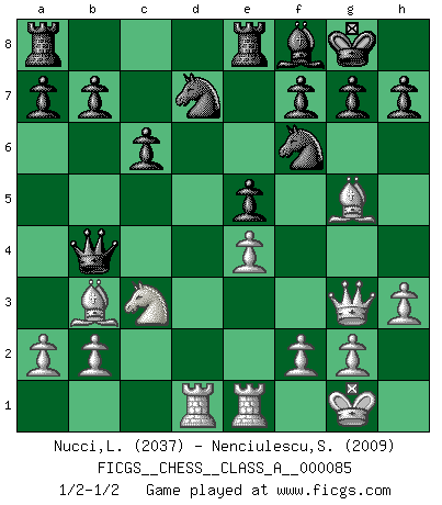 Last move : 1/2-1/2 2011 February 25 8:47:17 [Event "FICGS__CHESS__CLASS_A__000085"] [Site "FICGS"] [Date "2011.01.07"] [Round "1"] [White "Nucci,Luciano"] [Black "Nenciulescu,Silviu"] [Result "1/2-1/2"] [WhiteElo "2037"] [BlackElo "2009"] 1.d4 d5 2.Nf3 c6 3.e3 Bg4 4.h3 Bxf3 5.Qxf3 Nf6 6.c4 e6 7.Nc3 Nbd7 8.Bd2 Be7 9.Be2 O-O 10.O-O dxc4 11.Bxc4 e5 12.Rfe1 Qb6 13.Bb3 Bd6 14.Qg3 Rfe8 15.e4 Qxd4 16.Rad1 Bc5 17.Be3 Qb4 18.Bh6 Bf8 19.Bg5 Be7 20.Bh6 Bf8 21.Bg5 1/2-1/2 Queen's pawn game Kingside Castling by player Black (move 9) Kingside Castling by player White (move 10) This chess game ended in a draw. Follow this game move after move (download)War is the child of passion, passion is the child of narcissism and narcissism is the child. (...) Another game ? (Thibault de Vassal) Obwohl ich alt bin, darf mir niemand den Finger in den Mund stecken, sonst beisse ich. (Wilhelm Steinitz) El Ajedrez hace al hombre ser mas sabio y ver mas claro. (Vladimir Putin) Tous ces prétendus hommes politiques sont les pions, les Cavaliers, les Tours ou les Fous d'une partie d'échecs qui se jouera tant qu'un hasard ne renversera pas l'échiquier. (Honoré de Balzac) Two beer, or not two beer. (Unknown)
