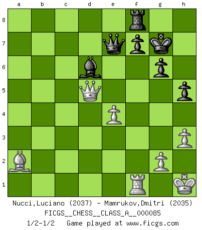 Last move : 1/2-1/2 2011 March 5 7:16:37 [Event "FICGS__CHESS__CLASS_A__000085"] [Site "FICGS"] [Date "2011.01.07"] [Round "1"] [White "Nucci,Luciano"] [Black "Mamrukov,Dmitri"] [Result "1/2-1/2"] [WhiteElo "2037"] [BlackElo "2035"] 1.d4 d5 2.Nf3 Nf6 3.e3 Bg4 4.h3 Bxf3 5.Qxf3 e6 6.Bd3 c5 7.c3 Nc6 8.Nd2 Bd6 9.Qe2 O-O 10.O-O Rc8 11.dxc5 Bxc5 12.b3 Qe7 13.a3 e5 14.Bf5 Rcd8 15.Bc2 e4 16.Bb2 Qe5 17.b4 Bd6 18.f4 exf3 19.Nxf3 Qe7 20.c4 dxc4 21.Bxf6 Qxf6 22.Qxc4 g6 23.Rad1 a5 24.Kh1 axb4 25.axb4 Bxb4 26.Nd4 Qe7 27.Nxc6 bxc6 28.Rxd8 Rxd8 29.Bb3 Rf8 30.Qxc6 Kg7 31.e4 Bd6 32.Qd5 h5 33.Ba2 1/2-1/2 Queen's pawn game Kingside Castling by player Black (move 9) Kingside Castling by player White (move 10) This chess game ended in a draw. Follow this game move after move (download)Everything is in a state of flux, and this includes the world of Chess. (Mikhail Botvinnik) Es hat in meinem Leben Zeiten gegeben, da ich sehr nahe daran war zu glauben, daß ich auch nicht eine einzige Schachpartie verlieren könnte. (José Raúl Capablanca) ¿Esta Bobby Fischer algo cuerdo?. (Salo Flohr) Tout change constamment, y compris dans le monde des Echecs. (Botvinnik) Life is the sum of all your choices. (Albert Camus)