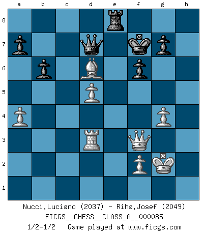 Last move : 1/2-1/2 2011 February 6 14:32:33 [Event "FICGS__CHESS__CLASS_A__000085"] [Site "FICGS"] [Date "2011.01.07"] [Round "1"] [White "Nucci,Luciano"] [Black "Riha,Josef"] [Result "1/2-1/2"] [WhiteElo "2037"] [BlackElo "2049"] 1.d4 Nf6 2.Nf3 d5 3.e3 e6 4.Bd3 c5 5.b3 Nc6 6.Bb2 Be7 7.Nbd2 O-O 8.O-O b6 9.a3 Bb7 10.Ne5 cxd4 11.Nxc6 Bxc6 12.exd4 Ne4 13.Re1 Nxd2 14.Qxd2 Bd6 15.c4 dxc4 16.bxc4 Qh4 17.g3 Qh5 18.d5 exd5 19.Be2 Qg6 20.cxd5 Bd7 21.Bd3 Bf5 22.Bf1 Be4 23.Bg2 Bxg2 24.Kxg2 Rac8 25.Rac1 Rxc1 26.Qxc1 Qf5 27.Qc4 Rd8 28.a4 f6 29.g4 Qd7 30.h3 Bc5 31.Rd1 h5 32.Rd3 hxg4 33.hxg4 Kf7 34.Bc3 Rc8 35.Qe4 Re8 36.Qf3 Kg8 37.Bd2 Bd6 38.Bf4 Kf7 39.Bxd6 1/2-1/2 Queen's pawn game Kingside Castling by player Black (move 7) Kingside Castling by player White (move 8) This chess game ended in a draw. Follow this game move after move (download)I like to say that Bobby Fischer was the greatest player ever. But what made Fischer a genius was his ability to blend an American freshness and pragmatism with Russian ideas about strategy. (Bruce Pandolfini) Habe Mut, dich deines eigenen Verstandes zu bedienen. (Immanuel Kant) Alekhine es un poeta que crea un trabajo de arte de algo que raramente inspiraría a otra persona a mandar una tarjeta postal. (Max Euwe) Il s'avisa de me proposer d'apprendre les échecs qu'il jouait un peu... me voilà forcené des échecs. J'achète un échiquier, je m'enferme dans ma chambre, j'y passe des jours et des nuits à vouloir apprendre par cur toutes les parties. (Jean-Jacques Rousseau, Confessions) Just because you do not take an interest in politics doesn't mean politics won't take an interest in you. (Pericles 430 B.C.)
