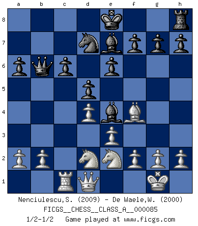 Last move : 1/2-1/2 2011 January 26 23:10:25 [Event "FICGS__CHESS__CLASS_A__000085"] [Site "FICGS"] [Date "2011.01.07"] [Round "1"] [White "Nenciulescu,Silviu"] [Black "De Waele,Willy"] [Result "1/2-1/2"] [WhiteElo "2009"] [BlackElo "2000"] 1.d4 d5 2.c4 c6 3.Nf3 Nf6 4.cxd5 cxd5 5.Nc3 Nc6 6.Bf4 Bf5 7.e3 e6 8.Bb5 Nd7 9.Qa4 Rc8 10.O-O a6 11.Bxc6 Rxc6 12.Rfc1 Be7 13.Ne2 Qb6 14.Rxc6 bxc6 15.Rc1 Bd3 16.Qd1 Be4 17.Nd2 1/2-1/2 QGD Slav : Exchange variation, 6.Bf4 Bf5 Kingside Castling by player White (move 10) This chess game ended in a draw. Follow this game move after move (download)A sacrifice is best refuted by accepting it. (Wilhelm Steinitz) Es ist wirklich schade, dass so viele Schachspieler nicht auf ihr Äußeres achten! (Alexandra Kosteniuk) ¿Quién es tu oponente esta tarde? Esta tarde mi oponente son las piezas negras. (Akiba Rubinstein) D'abord les bases : Jouez et étudiez, puis étudiez et jouez, ensuite jouez et étudiez, puis étudiez et jouez. Deuxièmement : Donnez toujours le meilleur de vous-même ! (Ken Smith) Memory... is the diary that we all carry with us. (Oscar Wilde, The Importance of Being Earnest)