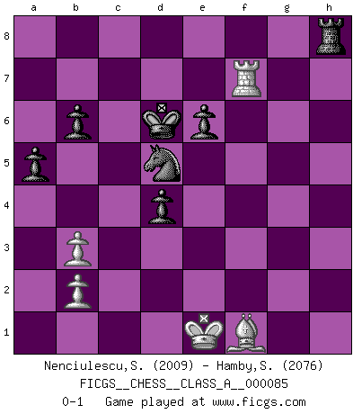 Last move : 0-1 2011 September 10 21:15:21 [Event "FICGS__CHESS__CLASS_A__000085"] [Site "FICGS"] [Date "2011.01.07"] [Round "1"] [White "Nenciulescu,Silviu"] [Black "Hamby,Stephen"] [Result "0-1"] [WhiteElo "2009"] [BlackElo "2076"] 1.d4 Nf6 2.c4 e6 3.Nf3 d5 4.cxd5 exd5 5.Bg5 Be7 6.e3 c6 7.Bd3 Bg4 8.Qb3 Qb6 9.Ne5 Qxb3 10.axb3 Nfd7 11.f4 Nxe5 12.dxe5 Bxg5 13.fxg5 Nd7 14.Bc2 Nxe5 15.O-O h6 16.h3 Be6 17.gxh6 Rxh6 18.Nd2 Ke7 19.Nf3 Rh5 20.Nd4 c5 21.Nxe6 fxe6 22.Ra5 Kd6 23.Ra4 a5 24.Rfa1 Rah8 25.Bd1 Rg5 26.h4 Rg3 27.Kf2 Rg6 28.Be2 Rf6+ 29.Kg1 b6 30.Rf1 Rfh6 31.h5 g6 32.g4 gxh5 33.gxh5 Nd7 34.Raf4 Ke5 35.Kf2 Nf6 36.Ke1 Nxh5 37.Rg4 Nf6 38.Rg5+ Kd6 39.Bd3 d4 40.exd4 cxd4 41.Rg7 Rh1 42.Rf7 Rxf1+ 43.Bxf1 Nd5 0-1 Queen's pawn game Kingside Castling by player White (move 15) Player Black won this chess game. Follow this game move after move (download)A big shock; the best chess player in history has passed away. (Lajos Portisch, about Bobby Fischer's death) Ich moechte nie einem Club beitreten, der Leute wie mich als Mitglieder aufnimmt. (Woody Allen) No nos podemos resistir a la fascinación de un sacrificio ya que la pasión por los sacrificios es parte de la naturaleza de un jugador de Ajedrez. (Rudolf Spielman) Toutes les manuvres exécutées sur une colonne ouverte ont pour but ultime l'intrusion définitive sur la septième ou la huitième rangée, en plein cur de la position ennemie. (Aaron Nimzovitch) Games, world of games... There's always an opponent, and there's always a victim. (Revolver, movie)