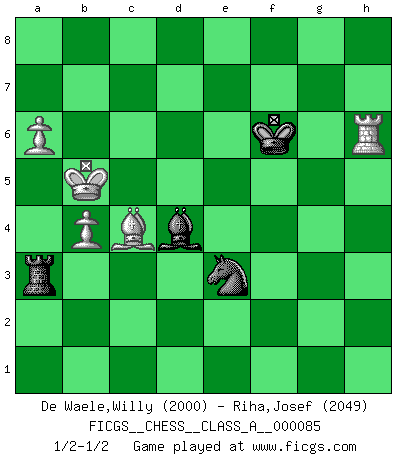 Last move : 1/2-1/2 2011 January 20 13:47:43 [Event "FICGS__CHESS__CLASS_A__000085"] [Site "FICGS"] [Date "2011.01.07"] [Round "1"] [White "De Waele,Willy"] [Black "Riha,Josef"] [Result "1/2-1/2"] [WhiteElo "2000"] [BlackElo "2049"] 1.e4 c5 2.Nf3 d6 3.d4 cxd4 4.Nxd4 Nf6 5.Nc3 a6 6.Be3 e5 7.Nb3 Be6 8.f3 Be7 9.Qd2 Nbd7 10.g4 Qc7 11.O-O-O h6 12.h4 b5 13.Rh2 b4 14.Nd5 Bxd5 15.exd5 Nb6 16.Qxb4 Nfxd5 17.Rxd5 Nxd5 18.Qe4 Nxe3 19.Qxa8+ Qd8 20.Qxd8+ Bxd8 21.Bxa6 h5 22.g5 f6 23.Kd2 Bb6 24.gxf6 gxf6 25.a4 Rg8 26.Re2 Nf5 27.a5 Bg1 28.Bb7 Nxh4 29.Re1 Rg2 30.Kc3 Nf5 31.a6 Bb6 32.Nd2 Kd7 33.Ne4 Ne3 34.Nxf6+ Ke6 35.Nxh5 Rxc2+ 36.Kb3 Rg2 37.f4 Rh2 38.Rh1 Rf2 39.Ng7+ Kf7 40.fxe5 Kxg7 41.exd6 Rd2 42.Ka4 Rxd6 43.b4 Ba7 44.Rh3 Rd1 45.Be4 Ra1+ 46.Kb5 Kf6 47.Rh5 Bd4 48.Bd3 Ke6 49.Rh4 Kd5 50.Be4+ Ke5 51.Bg6 Kd5 52.Bf7+ Ke5 53.Rh5+ Kf6 54.Bc4 Ra3 55.Rh6+ 1/2-1/2 Sicilian : Najdorf, Byrne (English) attack Queenside Castling by player White (move 11) 10 pieces endgame at move 41 : White KRBPPP , Black KRBN WHITE : King + 1 Rook 1 Bishop 3 Pawns BLACK : King + 1 Rook 1 Bishop 1 Knight 9 pieces endgame at move 42 : White KRBPP , Black KRBN WHITE : King + 1 Rook 1 Bishop 2 Pawns BLACK : King + 1 Rook 1 Bishop 1 Knight This chess game ended in a draw. Follow this game move after move (download)I have always a slight feeling of pity for the man who has no knowledge of Chess. (Siegbert Tarrasch) Ich habe Kasparov in Rente geschickt. (Veselin Topalov) El Ajedrez por encima de todo... ¡es una pelea!. (Emanuel Lasker) Un footballeur joue avec ses pieds, parfois avec sa tête. Un joueur d'échecs ne joue qu'avec sa tête. Et quand il ne joue plus, il meurt. (Jacob Murray) Kids, you tried your best and you failed miserably. The lesson is, never try. (Simpsons)
