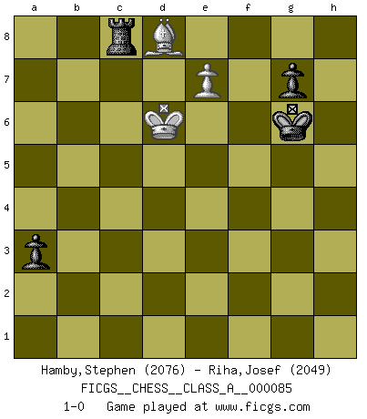 Last move : 1-0 2011 September 16 8:45:30 [Event "FICGS__CHESS__CLASS_A__000085"] [Site "FICGS"] [Date "2011.01.07"] [Round "1"] [White "Hamby,Stephen"] [Black "Riha,Josef"] [Result "1-0"] [WhiteElo "2076"] [BlackElo "2049"] 1.c4 e6 2.Nc3 Bb4 3.d4 Nf6 4.f3 d5 5.a3 Bxc3+ 6.bxc3 c5 7.cxd5 Nxd5 8.dxc5 Qa5 9.e4 Nf6 10.Be3 O-O 11.Qb3 Nfd7 12.a4 Qc7 13.Qa3 Nc6 14.a5 f5 15.Nh3 Nf6 16.Nf2 Rb8 17.a6 bxa6 18.Bxa6 Bxa6 19.Qxa6 f4 20.Bd2 Rbd8 21.Ke2 Nd7 22.Nd3 Nde5 23.Nxe5 Nxe5 24.Rhd1 Nc6 25.Be1 Kh8 26.Bh4 Rxd1 27.Rxd1 Rb8 28.Rd2 h6 29.Bf2 Rb3 30.Qc4 Qb7 31.g3 fxg3 32.hxg3 Ra3 33.g4 Kh7 34.Bg3 e5 35.g5 hxg5 36.Ke3 Qe7 37.Rh2+ Kg6 38.Rd2 Kh7 39.Kd3 Ra5 40.Rh2+ Kg6 41.Bf2 Qf7 42.Qxf7+ Kxf7 43.Rh8 Ra6 44.Kc4 Ne7 45.Ra8 Ra4+ 46.Kb5 Ra3 47.Be3 Rxc3 48.Bxg5 Rb3+ 49.Kc4 Ra3 50.Rd8 Nc6 51.Rd7+ Kg6 52.Bd8 Kh5 53.Rd6 Nd4 54.c6 Rxf3 55.Rxd4 exd4 56.c7 Rc3+ 57.Kxd4 Rc1 58.e5 a5 59.e6 Kg6 60.Ke5 a4 61.Kd6 a3 62.c8Q Rxc8 63.e7 1-0 English Opening Kingside Castling by player Black (move 10) 10 pieces endgame at move 55 : White KRBPP , Black KRPPP WHITE : King + 1 Rook 1 Bishop 2 Pawns BLACK : King + 1 Rook 3 Pawns 9 pieces endgame at move 55 : White KBPP , Black KRPPP WHITE : King + 1 Bishop 2 Pawns BLACK : King + 1 Rook 3 Pawns 8 pieces endgame at move 57 : White KBPP , Black KRPP WHITE : King + 1 Bishop 2 Pawns BLACK : King + 1 Rook 2 Pawns Promotion Queen by player White (move 62) 7 pieces endgame at move 62 : White KBP , Black KRPP WHITE : King + 1 Bishop 1 Pawn BLACK : King + 1 Rook 2 Pawns Player White won this chess game. Follow this game move after move (download)I thought the most common mistake [in chess] was the first one: Learning the game :P (Garvin Gray, FICGS forum) Das Zentrum ist der Balkan des Schachbretts - Kriegshandlungen können in jedem Moment ausbrechen. (Aaron Nimzowitsch) No hay precio que sea tan grande por la cabellera del Rey enemigo. (Koblentz) La menace est plus forte que l'exécution. (Aaron Nimzovitch) Computers make it easier to do a lot of things, but most of the things they make it easier to do don't need to be done. (Andy Rooney)
