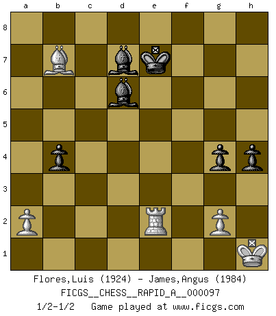 Last move : 1/2-1/2 2011 April 17 9:55:49 [Event "FICGS__CHESS__RAPID_A__000097"] [Site "FICGS"] [Date "2011.01.07"] [Round "1"] [White "Flores,Luis"] [Black "James,Angus"] [Result "1/2-1/2"] [WhiteElo "1924"] [BlackElo "1984"] 1.e4 c5 2.Nf3 d6 3.d4 cxd4 4.Nxd4 Nf6 5.Nc3 a6 6.Bg5 e6 7.f4 Qb6 8.Qd2 Qxb2 9.Rb1 Qa3 10.e5 h6 11.Bh4 dxe5 12.fxe5 g5 13.exf6 gxh4 14.Be2 Qa5 15.O-O Nd7 16.Kh1 Qg5 17.Rf4 e5 18.Nd5 exd4 19.Qxd4 Bc5 20.Qe4+ Kd8 21.Rf5 Re8 22.Qxe8+ Kxe8 23.Rxg5 hxg5 24.Nc7+ Kd8 25.Nxa8 Nxf6 26.Bf3 b5 27.Rd1+ Ke7 28.Nc7 Bb6 29.Nd5+ Nxd5 30.Bxd5 f5 31.c3 Bd7 32.Bb7 a5 33.h3 g4 34.hxg4 fxg4 35.Ba6 b4 36.cxb4 axb4 37.Bb7 Bc5 38.Rd2 Bd6 39.Re2+ 1/2-1/2 Sicilian : Najdorf, 7...Qb6 Kingside Castling by player White (move 15) This chess game ended in a draw. Follow this game move after move (download)Chess is a beautiful mistress. (Bent Larsen) Ein Kibitz ist einer, der deinem Gegner gute Ratschläge gibt. (Andrew Soltis) Alekhine es un poeta que crea un trabajo de arte de algo que raramente inspiraría a otra persona a mandar una tarjeta postal. (Max Euwe) Si je n'étais pas joueur d'échecs, je serais le meilleur dans quelque chose d'autre. (Anatoli Karpov) The Internet isn't free. It just has an economy that makes no sense to capitalism. (Brad Shapcott)