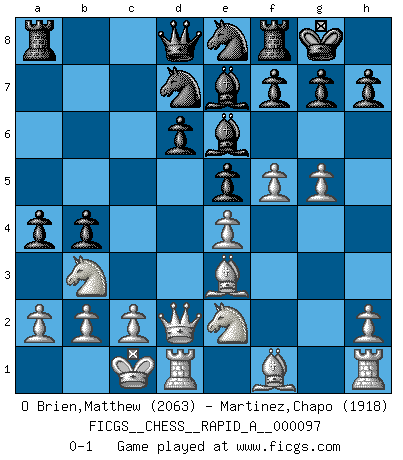 Last move : 0-1 2011 March 30 14:6:56 [Event "FICGS__CHESS__RAPID_A__000097"] [Site "FICGS"] [Date "2011.01.07"] [Round "1"] [White "O Brien,Matthew"] [Black "Martinez,Chapo"] [Result "0-1"] [WhiteElo "2063"] [BlackElo "1918"] 1.e4 c5 2.Nf3 d6 3.d4 cxd4 4.Nxd4 Nf6 5.Nc3 a6 6.Be3 e5 7.Nb3 Be6 8.f3 Be7 9.Qd2 O-O 10.O-O-O Nbd7 11.g4 b5 12.g5 b4 13.Ne2 Ne8 14.f4 a5 15.f5 a4 0-1 This chess game has been lost on time (started : 2011.01.07 9:42:31) Sicilian : Najdorf, Byrne (English) attack Kingside Castling by player Black (move 9) Queenside Castling by player White (move 10) Player Black won this chess game. Follow this game move after move (download)When you see a good move, look for a better one. (Emanuel Lasker) Mutter, ich bin eben Ex-Weltmeister geworden. --beim nach Hause Kommen nach dem Verlust des WM-Titels an Mihail Botvinnik -- (Mikhail Nekhemyevich Tal) Hay dos clases de hombres: aquellos que se conforman en dejarse llevar por las circunstancias y que juegan barajas y aquellos decididos a controlar las circunstancias y que juegan al Ajedrez. (Mortimer Collins) Aidez vos pièces, elles vous aideront. (Paul Morphy) There are two kinds of people in the world, my friend. Those who have a loaded gun and those who dig. You dig ! (Blondie in The Good, The Bad and The Ugly)
