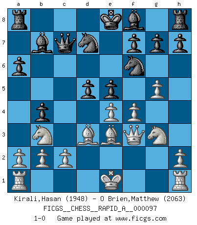 Last move : 1-0 2011 April 21 4:6:29 [Event "FICGS__CHESS__RAPID_A__000097"] [Site "FICGS"] [Date "2011.01.07"] [Round "1"] [White "Kirali,Hasan"] [Black "O Brien,Matthew"] [Result "1-0"] [WhiteElo "1948"] [BlackElo "2063"] 1.e4 c5 2.Nf3 d6 3.d4 cxd4 4.Nxd4 Nf6 5.Nc3 a6 6.Be3 e6 7.f4 b5 8.Qf3 Bb7 9.Bd3 Nbd7 10.g4 b4 11.Nce2 e5 12.Nb3 d5 13.Ng3 Qc7 14.g5 1-0 This chess game has been lost on time (started : 2011.01.07 9:42:31) Sicilian : Najdorf, Byrne (English) attack Player White won this chess game. Follow this game move after move (download)Human affairs are like a Chess game: only those who do not take it seriously can be called good players. (Hung Tzu Ch'eng) Matt entspricht nicht immer den Tatsachen. (Savielly Grigorievitsch Tartakower) La maestría del Ajedrez consiste esencialmente en analizar posiciónes de Ajedrez con precisión. (Mikhail Botvinnik) Tout change constamment, y compris dans le monde des Echecs. (Botvinnik) I can't decide which is riskier; taking crazy risks, or taking advice on crazy risks from a crazy risk taker. (Gregory House in House M.D.)