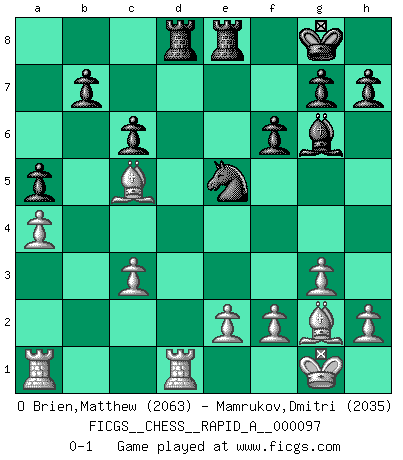 Last move : 0-1 2011 April 4 2:39:55 [Event "FICGS__CHESS__RAPID_A__000097"] [Site "FICGS"] [Date "2011.01.07"] [Round "1"] [White "O Brien,Matthew"] [Black "Mamrukov,Dmitri"] [Result "0-1"] [WhiteElo "2063"] [BlackElo "2035"] 1.Nf3 d5 2.d4 Nf6 3.c4 c6 4.Qc2 dxc4 5.Qxc4 Bg4 6.Nbd2 Nbd7 7.g3 e6 8.Bg2 Be7 9.O-O O-O 10.Ne5 Bh5 11.Nxd7 Nxd7 12.Nb3 a5 13.a4 e5 14.Rd1 Re8 15.dxe5 Nxe5 16.Qc2 Qb6 17.Be3 Bg6 18.Qc3 Qb4 19.Bd4 f6 20.Nc5 Qxc3 21.bxc3 Bxc5 22.Bxc5 Rad8 0-1 This chess game has been lost on time (started : 2011.01.07 9:42:31) Reti Opening Kingside Castling by player White (move 9) Kingside Castling by player Black (move 9) Player Black won this chess game. Follow this game move after move (download)A strong memory, concentration, imagination, and a strong will is required to become a great Chess player. (Bobby Fischer) Den Ruhm habe ich schon, jetzt brauche ich noch das Geld. (Wilhelm Steinitz) El juego del Ajedrez no es solamente una diversión quieta; algunas cualidades muy valuables de la mente se pueden adquirir y cultivar con el, como convertirlos en habitos disponibles para toda ocasión; ya que la vida es algo así como el Ajedrez. (Benjamin Franklin) On peut tirer plus d'utilité d'une partie perdue que de 100 parties gagnées. (Capablanca) There is a computer disease that anybody who works with computers knows about. It's a very serious disease and it interferes completely with the work. The trouble with computers is that you 'play' with them ! (Richard P. Feynman)