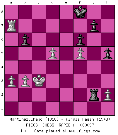 Last move : 1-0 2011 March 31 14:7:46 [Event "FICGS__CHESS__RAPID_A__000097"] [Site "FICGS"] [Date "2011.01.07"] [Round "1"] [White "Martinez,Chapo"] [Black "Kirali,Hasan"] [Result "1-0"] [WhiteElo "1918"] [BlackElo "1948"] 1.d4 Nf6 2.c4 e6 3.Nc3 Bb4 4.Qc2 c5 5.dxc5 O-O 6.a3 Bxc5 7.Nf3 Nc6 8.Bg5 Nd4 9.Nxd4 Bxd4 10.e3 Qa5 11.exd4 Qxg5 12.Qd2 Qxd2+ 13.Kxd2 b6 14.Bd3 Ba6 15.Rhc1 Nh5 16.b3 Rfd8 17.Be4 Rab8 18.Re1 Nf6 19.f3 Bb7 20.Bxb7 Rxb7 21.Rac1 d5 22.cxd5 Rbd7 23.Re5 Nxd5 24.Nxd5 exd5 25.f4 f6 26.Re6 Kf7 27.R1c6 Re8 28.f5 Rb7 29.Red6 Rbe7 30.Rxd5 Re2+ 31.Kc3 Rxg2 32.Rc7+ Re7 33.R5d7 Rxd7 34.Rxd7+ Kf8 35.Rxa7 h5 36.d5 1-0 This chess game has been lost on time (started : 2011.01.07 9:42:31) Nimzo-Indian : Classical, Pirc variation Kingside Castling by player Black (move 5) Player White won this chess game. Follow this game move after move (download)Best by test: 1. e4 (Bobby Fischer) Strategie ist, wie man ein Mädchen auf den Rücksitz bekommt. Taktik ist, was man tut, wenn man dann dort ist. (Anonymous) Todo se encuentra en un estado de flujo y esto incluye al mundo del Ajedrez. (Mikhail Botvinnik) Un journaliste : 'Vous préférez avoir une dame de plus sur l'échiquier ou au lit ?' Boris Spassky : 'Ca dépend de la position.' Panic is a sudden desertion of us, an a going over to the enemy of our imagination. (Christian Nevell Bovee)