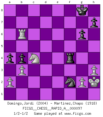 Last move : 1/2-1/2 2011 March 6 0:57:0 [Event "FICGS__CHESS__RAPID_A__000097"] [Site "FICGS"] [Date "2011.01.07"] [Round "1"] [White "Domingo,Jordi"] [Black "Martinez,Chapo"] [Result "1/2-1/2"] [WhiteElo "2004"] [BlackElo "1918"] 1.e4 c5 2.Nf3 d6 3.c3 Nf6 4.Be2 g6 5.O-O Bg7 6.Bb5+ Bd7 7.Bxd7+ Nfxd7 8.d4 O-O 9.Be3 Nc6 10.Qe2 cxd4 11.cxd4 Rc8 12.Nc3 e6 13.Rad1 a6 14.d5 Nce5 15.Nxe5 Nxe5 16.Bd4 b5 17.f4 Nc4 18.Bxg7 Kxg7 19.Rd3 b4 20.Nd1 Qb6+ 21.Kh1 Qb5 22.b3 Nb6 23.dxe6 fxe6 24.Qe3 Nd7 25.Kg1 Rc6 26.Nb2 Kg8 27.Rfd1 Rc2 28.R3d2 Rxd2 29.Qxd2 Qc5+ 30.Kh1 Nf6 31.Qxd6 Qxd6 32.Rxd6 Nxe4 33.Rxe6 Rxf4 34.h3 a5 35.Nc4 a4 36.Rb6 Nf2+ 37.Kh2 1/2-1/2 Sicilian Kingside Castling by player White (move 5) Kingside Castling by player Black (move 8) This chess game ended in a draw. Follow this game move after move (download)It is no time to be playing Chess when the house is on fire. (Italian Proverb) Ich hatte Zahnschmerzen im ersten Spiel. In der zweiten Partie tat mir der Kopf weh. In der dritten war es eine Rheuma-Attacke und während der vierten fühlte ich mich nicht gut. Und in der fünften? Nun, man muss doch nicht jedes Spiel gewinnen, oder? (Savielly Grigorievitsch Tartakower) Me siento como si fuera una pieza en una partida de Ajedrez, cuando mi oponente me indica: esa pieza no puede ser movida. (Soren Kierkegaard) Ce qui caractérise les parties de combat, c'est que si le défenseur a constamment de difficiles problèmes à résoudre, l'attaquant doit chercher sans relâche de nouvelles possibilités d'attaque. (Koblentz) I've lost money so fast in these clubs it's left me reeling. I've read every poker book ever written, but the only way to get better at the game is to go out and play with people who are really good. The problem is, you stand to lose a lot of money doing it. (Matt Damon)