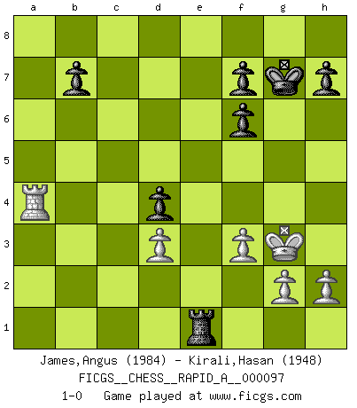Last move : 1-0 2011 May 13 18:10:29 [Event "FICGS__CHESS__RAPID_A__000097"] [Site "FICGS"] [Date "2011.01.07"] [Round "1"] [White "James,Angus"] [Black "Kirali,Hasan"] [Result "1-0"] [WhiteElo "1984"] [BlackElo "1948"] 1.e4 Nc6 2.Nf3 e5 3.Bb5 Nf6 4.d3 Bc5 5.c3 O-O 6.O-O d5 7.exd5 Qxd5 8.Bc4 Qd6 9.b4 Bb6 10.Ba3 Ne7 11.Nbd2 a5 12.Qa4 Ned5 13.Rae1 Nxc3 14.Qb3 Ncd5 15.bxa5 Bc5 16.Bxc5 Qxc5 17.Rxe5 c6 18.Ne4 Qxa5 19.Nxf6+ gxf6 20.Re4 Nc3 21.Re7 Nd5 22.Bxd5 Qxd5 23.Qxd5 cxd5 24.Ra1 Ra3 25.Ne1 Kg7 26.f3 Rd8 27.Kf2 Rd6 28.Re2 Rb6 29.Rc1 Be6 30.Kg3 d4 31.R1c2 Rb1 32.Rb2 Bxa2 33.Rxa2 Rxa2 34.Rxa2 Rxe1 35.Ra4 1-0 This chess game has been lost on time (started : 2011.01.07 9:42:31) KP : Nimzovich defense Kingside Castling by player Black (move 5) Kingside Castling by player White (move 6) Player White won this chess game. Follow this game move after move (download)Chess is a sea in which a gnat may drink and an elephant may bathe. (Hindu proverb) Sicherlich können nur Meister einen Stil haben. Daß ein nicht-Meister auch nur ein einziges Mal in seinem Leben eine Partie folgerecht durchführte, habe ich niemals bemerkt. (Emanuel Lasker) Un entendimiento a fondo de las continuaciones típicas del mate, hace de las combinaciones de sacrificio mas complicadas conducirlas a ellas no solo sin dificultad, sino casi de una manera natural. (Siegbert Tarrasch) Il (Jacob Murray) ne joue pas pour le bon coup, mais pour le meilleur. (Eloi Relange) Locking firmely the window serves nothing, only small thiefs pass through there, the big thiefs enter through the front door. (Luc-Olivier Leclerc)