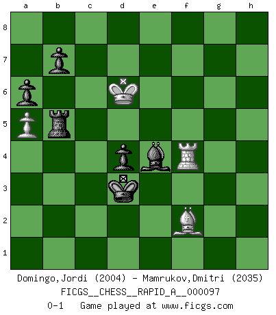 Last move : 0-1 2011 June 5 23:10:4 [Event "FICGS__CHESS__RAPID_A__000097"] [Site "FICGS"] [Date "2011.01.07"] [Round "1"] [White "Domingo,Jordi"] [Black "Mamrukov,Dmitri"] [Result "0-1"] [WhiteElo "2004"] [BlackElo "2035"] 1.e4 c6 2.d4 d5 3.e5 Bf5 4.Nc3 e6 5.g4 Bg6 6.Nge2 c5 7.h4 h5 8.Nf4 Bh7 9.Nxh5 Nc6 10.dxc5 Bxc5 11.Bb5 Qc7 12.Bxc6+ Qxc6 13.Qf3 O-O-O 14.Nxg7 Bb4 15.Rh3 d4 16.a3 Be4 17.Qxf7 Bxc3+ 18.bxc3 Rxh4 19.Rxh4 Qxc3+ 20.Kf1 Qxa1 21.Qf4 Bd5 22.Qd2 Ne7 23.f4 Kb8 24.Rh7 Qb1 25.Nxe6 Bxe6 26.Rxe7 Bxg4 27.Rg7 Bf5 28.Rg5 Bxc2 29.e6 Rc8 30.Qe1 Be4 31.Bd2 Qd3+ 32.Qe2 Qh3+ 33.Kf2 Qh4+ 34.Kf1 Qh1+ 35.Rg1 Qh3+ 36.Ke1 Qxe6 37.Qb5 Re8 38.Qe5+ Qxe5 39.fxe5 Kc8 40.Bf4 Kd7 41.Rg4 Ke6 42.Bg3 Kd5 43.Rg7 Kc4 44.Kd2 Bf3 45.Rd7 Bc6 46.Rd6 Bd5 47.Rg6 Rf8 48.Rf6 Rg8 49.Bf2 Rg4 50.Rf8 Be6 51.Rb8 Rf4 52.Be1 Bd5 53.Ra8 a6 54.Rc8+ Bc6 55.a4 Rf3 56.e6 Rd3+ 57.Kc2 Re3 58.Bd2 Rxe6 59.a5 Rf6 60.Be1 Rf1 61.Kd2 Rf3 62.Kc2 Rh3 63.Rf8 Be4+ 64.Kc1 Kd3 65.Kb2 Re3 66.Bf2 Re2+ 67.Kb3 Bd5+ 68.Kb4 Rb2+ 69.Kc5 Bc6 70.Rf4 Rb5+ 71.Kd6 Be4 0-1 Caro-Kann : Advance variation Queenside Castling by player Black (move 13) 10 pieces endgame at move 58 : White KRBP , Black KRBPPP WHITE : King + 1 Rook 1 Bishop 1 Pawn BLACK : King + 1 Rook 1 Bishop 3 Pawns Player Black won this chess game. Follow this game move after move (download)Pawns are born free, yet they are everywhere in chains. (Rick Kennedy) Kann Schach nicht schließlich das Nationalspiel der Deutschen werden? Und welche weiteren Ausblicke bieten sich dann dar! Welche Hebung des allgemeinen Kultur-Niveaus, ja der Moral, wenn das Schachbrett den Kartentisch verdrängen würde! Wahrlich, ein Ziel, des Schweißes der Edlen wert! (Siegbert Tarrasch) Alekhine es un poeta que crea un trabajo de arte de algo que raramente inspiraría a otra persona a mandar una tarjeta postal. (Max Euwe) La menace est plus forte que l'exécution. (Aaron Nimzovitch) I don't diet. I just don't eat as much as I'd like to. (Linda Evangelista, supermodel)