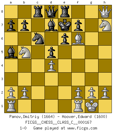 Last move : 1-0 2011 January 9 2:18:42 [Event "FICGS__CHESS__CLASS_C__000167"] [Site "FICGS"] [Date "2011.01.07"] [Round "1"] [White "Panov,Dmitriy"] [Black "Hoover,Edward"] [Result "1-0"] [WhiteElo "1664"] [BlackElo "1600"] 1.e4 e6 2.d4 d5 3.e5 c5 4.c3 cxd4 5.cxd4 Bb4 6.Nc3 Ne7 7.Nf3 Nbc6 8.Bd3 Bd7 9.O-O Rc8 10.Bd2 Ba5 11.Nb5 O-O 12.Bxh7+ Kxh7 13.Ng5+ Kg8 14.Qh5 Re8 15.Qh7+ Kf8 16.Qh8+ Ng8 17.Nh7+ Ke7 18.Bg5+ Nf6 19.exf6+ gxf6 20.Bxf6+ 1-0 French : Advance variation Kingside Castling by player White (move 9) Kingside Castling by player Black (move 11) Player White won this chess game. Follow this game move after move (download)Chess is played with the mind and not with the hands ! (Renaud and Kahn) Das Schachspiel ist ein See, in welchem eine Mücke baden und ein Elefant ertrinken kann. (Emanuel Lasker) Solo los afeminados hacen el Enroque. (Rob Sillars) C'est une question de caractère, Beaucoup de gens perdent leur motivation très vite. D'autres, ils sont rares, peuvent la conserver très longtemps. J'aime les échecs, encore aujourd'hui je suis heureux d'analyser des parties. J'aime toujours gagner, je déteste encore perdre. Bien jouer est important pour mon intégrité intellectuelle et morale. Et puis les échecs vivent en ce moment une période historique grâce à Internet. Ils se développent dans les systèmes éducatifs à travers le monde. Ils sortent de leur ghetto, et c'est mon rôle de mener à bien cette révolution. (Gary Kasparov) Fame, I have already. Now I need the money. (an elderly Steinitz)