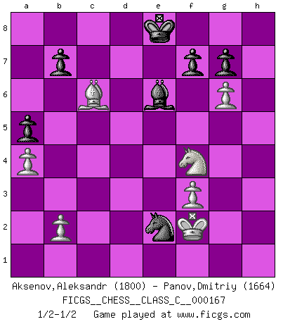 Last move : 1/2-1/2 2011 September 5 6:49:23 [Event "FICGS__CHESS__CLASS_C__000167"] [Site "FICGS"] [Date "2011.01.07"] [Round "1"] [White "Aksenov,Aleksandr"] [Black "Panov,Dmitriy"] [Result "1/2-1/2"] [WhiteElo "1800"] [BlackElo "1664"] 1.e4 e5 2.Nf3 Nf6 3.Nxe5 d6 4.Nf3 Nxe4 5.d4 d5 6.Bd3 Bd6 7.O-O O-O 8.c4 c6 9.Re1 Re8 10.Qb3 Na6 11.cxd5 cxd5 12.Nc3 Be6 13.a3 h6 14.Be3 Nxc3 15.Qxc3 Nb8 16.Bc2 Nd7 17.Qd3 Nf6 18.Ne5 Qb6 19.f3 Rac8 20.Rab1 Re7 21.Re2 Rec7 22.Kh1 a6 23.a4 Kf8 24.Bf2 Nh5 25.g3 Bb4 26.Kg2 Nf6 27.g4 Re8 28.Rd1 Bd6 29.Bg3 R7c8 30.h3 a5 31.Qb3 Qxb3 32.Bxb3 Kg8 33.Nd3 Bxg3 34.Kxg3 Kf8 35.h4 h5 36.g5 Ng8 37.Nf4 Ne7 38.Nxh5 Nf5+ 39.Kf2 Nxh4 40.Nf4 Nf5 41.g6 Rc6 42.Rh1 Nxd4 43.Bxd5 Nxe2 44.Rh8+ Ke7 45.Rxe8+ Kxe8 46.Bxc6+ 1/2-1/2 Petrov : Classical attack, Marshall variation Kingside Castling by player White (move 7) Kingside Castling by player Black (move 7) This chess game ended in a draw. Follow this game move after move (download)Those who say they understand Chess, understand nothing. (Robert Hubner) Ich habe Kasparov in Rente geschickt. (Veselin Topalov) Tu no necesitas jugar muy bien, únicamente ayudar a tu oponenet a que juegue muy mal. (Genrikh Chepukaitis) Une platitude souvent récitée à propos des Echecs est qu'une des choses les plus difficiles à réaliser est de gagner une position gagnante. Cela ne manque pas de sens mais, pour ma part, j'ai toujours trouvé plus difficile de gagner une position perdante. (Tim Krabbe) Go and wake up your luck. (Persian saying)
