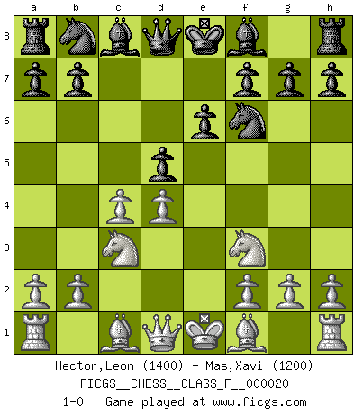 Last move : 1-0 2007 January 22 18:54:16 [Event "FICGS__CHESS__CLASS_F__000020"] [Site "FICGS"] [Date "2006.12.05"] [Round "1"] [White "Hector,Leon"] [Black "Mas,Xavi"] [Result "1-0"] [WhiteElo "1400"] [BlackElo "1200"] 1.e4 c6 2.d4 d5 3.exd5 cxd5 4.c4 e6 5.Nc3 Nf6 6.Nf3 1-0 This chess game has been lost on time (started : 2006.12.05 21:8:50) Caro-Kann : Panov-Botvinnik attack Player White won this chess game. Follow this game move after move (download)We must make sure that Chess will not be like a dead language, very interesting, but for a very small group. (Sytze Faber) Kein Großmeister ist normal. Sie unterscheiden sich nur im Ausmaß Ihrer Verrücktheit. (Viktor Kortschnoi) La táctica fluye a partir de una posición superior. (Bobby Fischer) Demandez au pauvre Cg1 ce qu'il en pense. Eduard Gufeld à propos de la variante Saemisch de l'Est-Indienne. I don't believe in psychology. I believe in good moves. (Bobby Fischer)