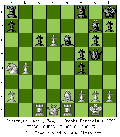 Last move : 1-0 2011 April 29 10:5:32 [Event "FICGS__CHESS__CLASS_C__000167"] [Site "FICGS"] [Date "2011.01.07"] [Round "1"] [White "Biason,Adriano"] [Black "Jacobs,Francois"] [Result "1-0"] [WhiteElo "1744"] [BlackElo "1679"] 1.d4 Nf6 2.c4 g6 3.Nc3 Bg7 4.e4 d6 5.Nf3 O-O 6.Be2 e5 7.O-O Nc6 8.d5 Ne7 9.b4 Nh5 10.Re1 f5 11.Ng5 Nf4 12.Rb1 c6 13.c5 Nexd5 14.exd5 Qxg5 15.Bxf4 exf4 16.dxc6 bxc6 17.cxd6 Kh8 18.Na4 Be6 19.Rc1 1-0 King's Indian : Orthodox, Aronin-Taimanov variation (Yugoslav attack / Mar del Plata variation) Kingside Castling by player Black (move 5) Kingside Castling by player White (move 7) Player White won this chess game. Follow this game move after move (download)Chess is above all, a fight ! (Emanuel Lasker) Schachspieler können ausgezeichnet Varianten am Schachbrett berechnen, aber nicht im realen Leben. Zu stark ist der Individualismus im Schach ausgeprägt, und für viele ist ein kleiner momentaner persönlicher Vorteil wichtiger als ein weit größerer Vorteil von morgen. (Anatoly Karpov) Aquellos que dicen que entienden al Ajedrez, no entienden nada. (Robert Hubner) Ce qui caractérise les parties de combat, c'est que si le défenseur a constamment de difficiles problèmes à résoudre, l'attaquant doit chercher sans relâche de nouvelles possibilités d'attaque. (Koblentz) When a man with money meets a man with experience, the man with experience leaves with money and the man with money leaves with experience. (Anonymous)