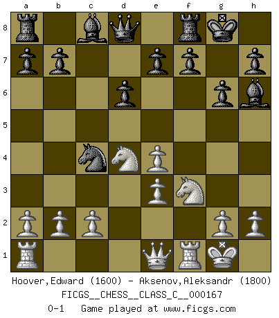 Last move : 0-1 2011 February 12 22:19:10 [Event "FICGS__CHESS__CLASS_C__000167"] [Site "FICGS"] [Date "2011.01.07"] [Round "1"] [White "Hoover,Edward"] [Black "Aksenov,Aleksandr"] [Result "0-1"] [WhiteElo "1600"] [BlackElo "1800"] 1.e4 c5 2.Nf3 d6 3.d4 cxd4 4.Nxd4 Nf6 5.Bd3 Nc6 6.Be3 Ng4 7.O-O Nxe3 8.fxe3 g6 9.Bc4 Ne5 10.Nd2 Bh6 11.Qe1 O-O 12.N2f3 Nxc4 0-1 Sicilian Kingside Castling by player White (move 7) Kingside Castling by player Black (move 11) Player Black won this chess game. Follow this game move after move (download)Chess is a more highly symbolic game, but the aggressions are therefore even more frankly represented in the play. It probably began as a war game; that is, the representation of a miniature battle between the forces of two kingdoms. (Karl Meninger) Bis zum Jahr 1971 verlief in meiner Schachkariere alles glatt. Dieses dramatische Match [Fischer-Taimanov 6:0] machte mein Leben zur Hölle. (Mark Taimanov) No hay otro maestro que tenga una voluntad terrífica de ganar. Al tablero, el irradía peligro y aún los oponentes mas fuertes tienden a congelarse como liebres cuando olfatean a una pantera. Aún sus debilidades son peligrosas. Con las blancas, su juego de apertura es predecible - te es posible hacer planes en su contra - pero es tan fuerte que tus planes casi nunca funcionan. En el juego medio, su precisión e invención son fabulosas y en finales, tú simplemente no le puedes vencer. (Experto Alemán anónimo) On croit qu'il y a plus de mauvais joueurs que de bons joueurs, c'est faux : Il y a autant de joueurs qui gagnent que de joueurs qui perdent. (Philippe Geluck) The weakness of an artist is dogma. (Josh Waitzkin)