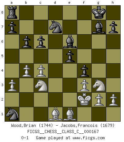 Last move : 0-1 2011 March 24 11:33:38 [Event "FICGS__CHESS__CLASS_C__000167"] [Site "FICGS"] [Date "2011.01.07"] [Round "1"] [White "Wood,Brian"] [Black "Jacobs,Francois"] [Result "0-1"] [WhiteElo "1744"] [BlackElo "1679"] 1.d4 Nf6 2.c4 g6 3.Nc3 Bg7 4.e4 d6 5.f3 O-O 6.Be3 e5 7.Nge2 c6 8.dxe5 dxe5 9.Qxd8 Rxd8 10.Kf2 Be6 11.Ng3 Na6 12.Be2 Rd7 13.Rhd1 b6 14.Rxd7 Nxd7 15.a3 f5 16.exf5 gxf5 17.Bd2 Nac5 18.b4 Nb3 19.Be1 Nxa1 20.Bd1 f4 0-1 King's Indian : Saemisch, Orthodox, 7.Nge2 c6 Kingside Castling by player Black (move 5) Player Black won this chess game. Follow this game move after move (download)Spassky will not be psyched out by Fischer. (Mike Goodall) Ich spiele ehrlich und spiele, um zu gewinnen. Wenn ich verliere nehme ich meine Medizin. (Robert James Fischer) Los asuntos humanos son como una partida de Ajedrez: solo aquellos que no lo toman seriamente, pueden ser llamados buenos jugadores. (Hung Tzu Ch'eng) J'ai vu le vaincu d'Echecs jouer des années durant dans l'espoir de la fête de la victoire. Car tu es plus riche de ce qu'elle existe si même elle n'est point pour toi. Ainsi de la perle du fond des mers. (Antoine de Saint-Exupéry) Establishing goals is all right if you don't let them deprive you of interesting detours. (Doug Larson)
