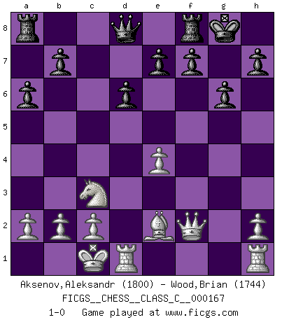 Last move : 1-0 2011 February 19 0:33:0 [Event "FICGS__CHESS__CLASS_C__000167"] [Site "FICGS"] [Date "2011.01.07"] [Round "1"] [White "Aksenov,Aleksandr"] [Black "Wood,Brian"] [Result "1-0"] [WhiteElo "1800"] [BlackElo "1744"] 1.e4 c5 2.Nf3 d6 3.d4 cxd4 4.Nxd4 Nf6 5.Nc3 a6 6.Be3 g6 7.f3 Bg7 8.Qd2 O-O 9.O-O-O Nc6 10.g4 Bxg4 11.fxg4 Nxd4 12.Bxd4 Nxg4 13.Bxg7 Kxg7 14.Be2 Nf2 15.Qd4+ Kg8 16.Qxf2 1-0 Sicilian : Najdorf, Byrne (English) attack Kingside Castling by player Black (move 8) Queenside Castling by player White (move 9) Player White won this chess game. Follow this game move after move (download)If I win a tournament, I win it by myself. I do the playing. Nobody helps me. (Bobby Fischer) Wie ich sie so einen nach dem anderen nieder mähte wurde meine Überlegenheit offensichtlich. (José Raúl Capablanca) Nos gusta pensar. (Gary Kasparov) On a dit que l'homme se distingue de l'animal par le fait qu'il achète plus de livres qu'il ne peut en lire. Je voudrais suggérer qu'inclure à la liste des livres quelques livres d'échecs rendrait la distinction manifeste. (Edward Lasker) Follow your passion, and success will follow you. (Arthur Buddhold)