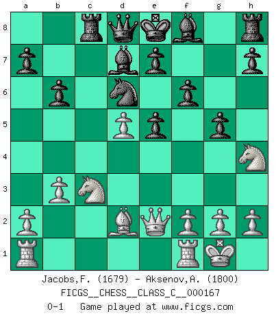 Last move : 0-1 2011 March 29 18:54:46 [Event "FICGS__CHESS__CLASS_C__000167"] [Site "FICGS"] [Date "2011.01.07"] [Round "1"] [White "Jacobs,Francois"] [Black "Aksenov,Aleksandr"] [Result "0-1"] [WhiteElo "1679"] [BlackElo "1800"] 1.e4 c5 2.c3 Nf6 3.e5 Nd5 4.d4 cxd4 5.Nf3 Nc6 6.cxd4 d6 7.Bc4 Nb6 8.Bb3 dxe5 9.d5 Na5 10.Nc3 Bg4 11.Ba4+ Nxa4 12.Qxa4+ Bd7 13.Qe4 f6 14.Bd2 Rc8 15.b3 b6 16.O-O Nb7 17.Qe2 Nd6 18.Nh4 g5 0-1 Sicilian : Alapin's variation (2.c3) Kingside Castling by player White (move 16) Player Black won this chess game. Follow this game move after move (download)The tactician must know what to do whenever something needs doing; the strategist must know what to do when nothing needs doing. (Savielly Tartakover) Sie führen leise Selbstgespräche, schlürfen lautstark ihre Getränke, schmatzen hörbar beim Essen, blasen ihrem Gegenüber Rauch in die Augen, niesen ihm ins Gesicht, starren ihn unverwandt an, bis er sich unter ihren Blicken windet, rutschen ständig auf ihrem Stuhl hin und her, rülpsen und bohren in der Nase. (Anonymous) Dios mío, Bobby Fischer juega tan simple. (Alexei Suetin) Les Echecs mettent en conflit, non pas deux intelligences, mais deux volontés. (Lasker) Memory is a crazy woman that hoards colored rags and throws away food. (Austin O'Malley)