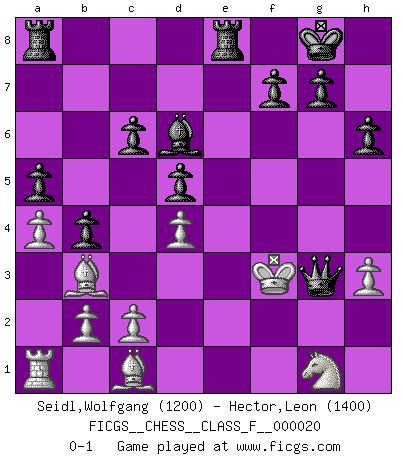 Last move : 0-1 2007 March 11 17:53:21 [Event "FICGS__CHESS__CLASS_F__000020"] [Site "FICGS"] [Date "2006.12.05"] [Round "1"] [White "Seidl,Wolfgang"] [Black "Hector,Leon"] [Result "0-1"] [WhiteElo "1200"] [BlackElo "1400"] 1.e4 e5 2.Qh5 Nc6 3.Nc3 Nf6 4.Qf3 Nd4 5.Qf5 Nxf5 6.exf5 d5 7.Bb5+ c6 8.Ba4 Bxf5 9.Nf3 Bd6 10.O-O b5 11.Bb3 e4 12.Ng5 Ng4 13.d4 Nxh2 14.Re1 O-O 15.a4 h6 16.Nh3 Bxh3 17.gxh3 Nf3+ 18.Kf1 Nxe1 19.Kxe1 b4 20.Ne2 a5 21.f4 exf3 22.Ng1 Re8+ 23.Kf2 Qh4+ 24.Kxf3 Qg3+ 0-1 Variation Patzer Opening : Patzer Opening Kingside Castling by player White (move 10) Kingside Castling by player Black (move 14) Player Black won this chess game. Follow this game move after move (download)Best by test: 1. e4 (Bobby Fischer) Strategie ist, wie man ein Mädchen auf den Rücksitz bekommt. Taktik ist, was man tut, wenn man dann dort ist. (Anonymous) Una buena memoria, concentración, imaginación y una fuerte voluntad, se requiere para llegar a ser un buen jugador. (Bobby Fischer) Il a essayé de se convaincre qu'il pourrait empêcher toutes les erreurs et ne jamais perdre. L'horreur ! Gary Kasparov au sujet de Robert Fischer. Wisdom doesn't necessarily come with age. Sometimes age just shows up all by itself. (Tom Wilson)