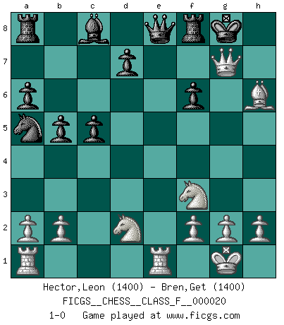 Last move : 1-0 2007 March 9 19:4:57 [Event "FICGS__CHESS__CLASS_F__000020"] [Site "FICGS"] [Date "2006.12.05"] [Round "1"] [White "Hector,Leon"] [Black "Bren,Get"] [Result "1-0"] [WhiteElo "1400"] [BlackElo "1400"] 1.e4 e5 2.Nf3 Nc6 3.Bb5 Bc5 4.c3 Nf6 5.O-O O-O 6.d4 exd4 7.cxd4 Nxe4 8.dxc5 Nxc5 9.Re1 a6 10.Bg5 f6 11.Bc4+ Ne6 12.Be3 Na5 13.Bd3 b5 14.Qc2 g6 15.Nbd2 c5 16.Bxg6 hxg6 17.Qxg6+ Ng7 18.Bh6 Qe8 19.Qxg7+ 1-0 Ruy Lopez : Classical defense, 4.c3 Kingside Castling by player White (move 5) Kingside Castling by player Black (move 5) Player White won this chess game. Follow this game move after move (download)A good sacrifice is one that is not necessarily sound but leaves your opponent dazed and confused. (Rudolph Spielmann) Bis jetzt ist Weiß einer wohlbekannten Analyse gefolgt. Aber jetzt begeht er einen schrecklichen Fehler: Er beginnt seinen eigenen Kopf zu benutzen. (Siegbert Tarrasch) Prefiero perder una partida realmente buena, que ganar una mala. (David Levy) Pour se monter efficace, un Cavalier a besoin d'avant-postes ! Les Cavaliers font les meilleurs bloqueurs de pions passés. The next best thing to gambling and winning is gambling and loosing. (Nick Dandalos)